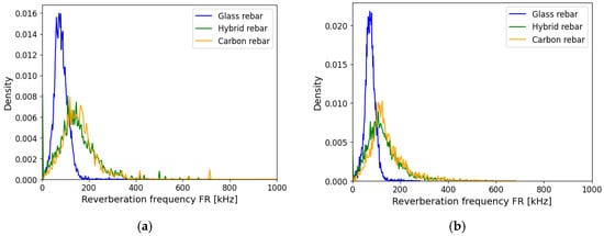 The reverberation frequency was determined after the amplitude peak of the signal. The attenuation method from Equation (14) was not modifying the obtained raw data as shown on Figure 15. The events were more concentrated in the center of gravity of the distribution. The shifting of the outcome from glass and carbon reinforcement can be noticed. The result of the hybrid and carbon rebar was excellently overlapped.