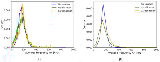 The average frequency AF is a highly used parameter in the concrete mechanism characterization to select the cracks subjected to tensile/shear mode or a combination of them—mixed mode []. The AF distribution of registered data was similar for each type of specimen. The attenuation assumption did not change the arrangement of the AE data as illustrated in Figure 16.