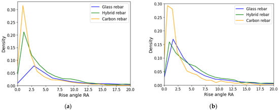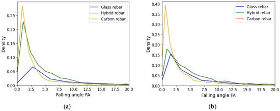 The RA and FA values defined the shape of the registered acoustic wave. The rise angle was determined by the ratio of the rise time and peak amplitude value, while the falling angle was the period from the peak amplitude to the end of the signal to the maximum amplitude value. The low range of the results are assigned for tensile breakage caused by the short duration of the event and higher frequency. The higher results values were delivered by shear loading modes due to longer rise time and lower frequencies []. The distribution of the rise angle and the falling angle is presented in Figure 17 and Figure 18. In both cases, the carbon fiber rebars are characterized by lower values of RA and FA. The distribution of hybrid data was slightly shifted to the carbon fiber center of gravity of the data, which can be affected by carbon fiber breakage. The data from hybrid and glass fiber profiles after the attenuation process are more similar than before in both cases. The dominance of the carbon fiber in the low values region has been preserved.
