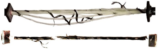 Glass fiber (up) and carbon fiber rebars (bottom) after experimental static tensile test.