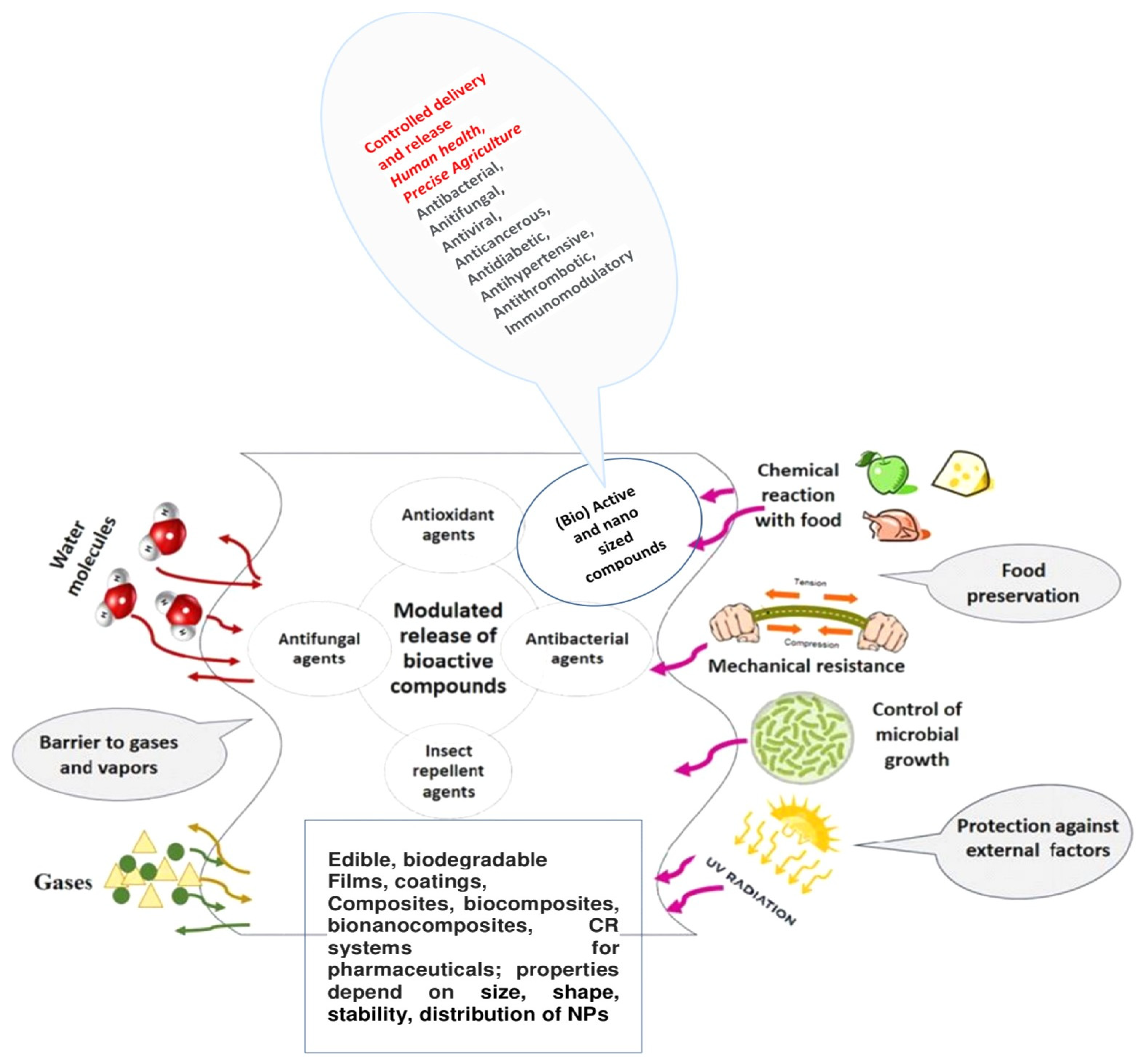 Table 1. (Bio)active agents used in advanced polymeric materials for agriculture, food preservation and packaging, biomedicine, cosmetics, etc. [39,40,41,42,43,44,45,46,47].