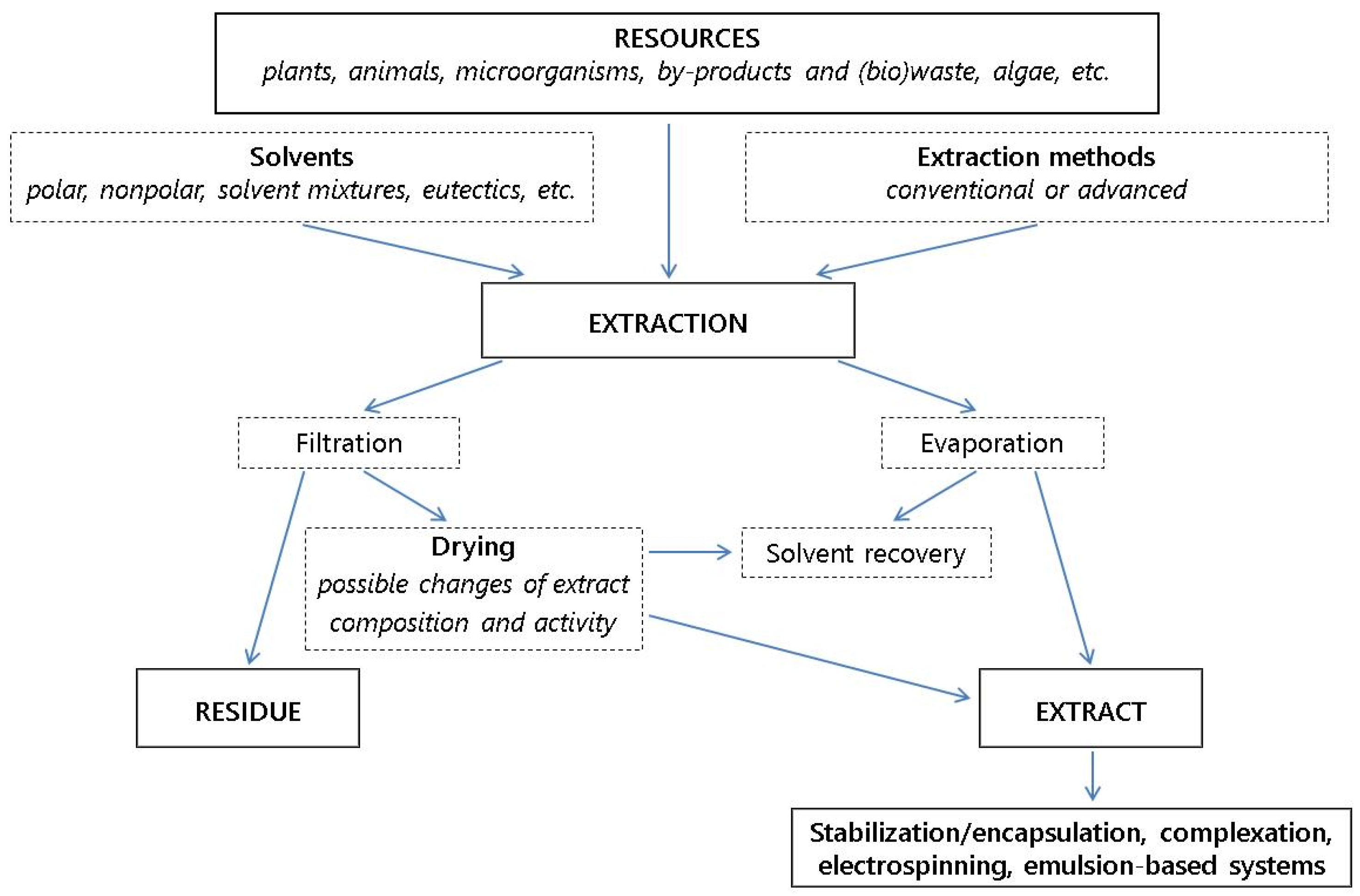 Figure 2. Flow diagram of the steps involved in the extraction and encapsulation applied for natural AC from different resources.