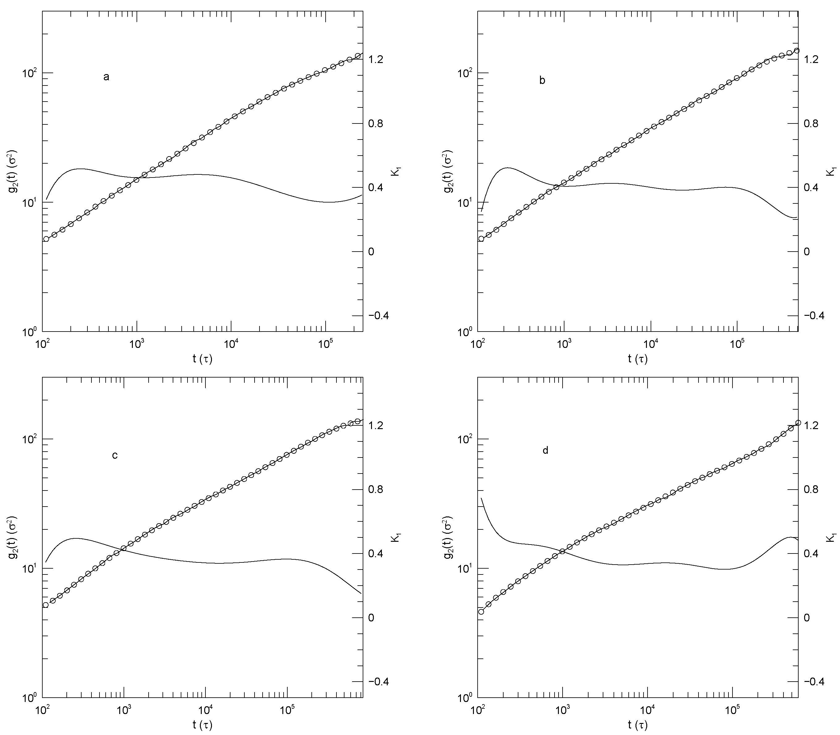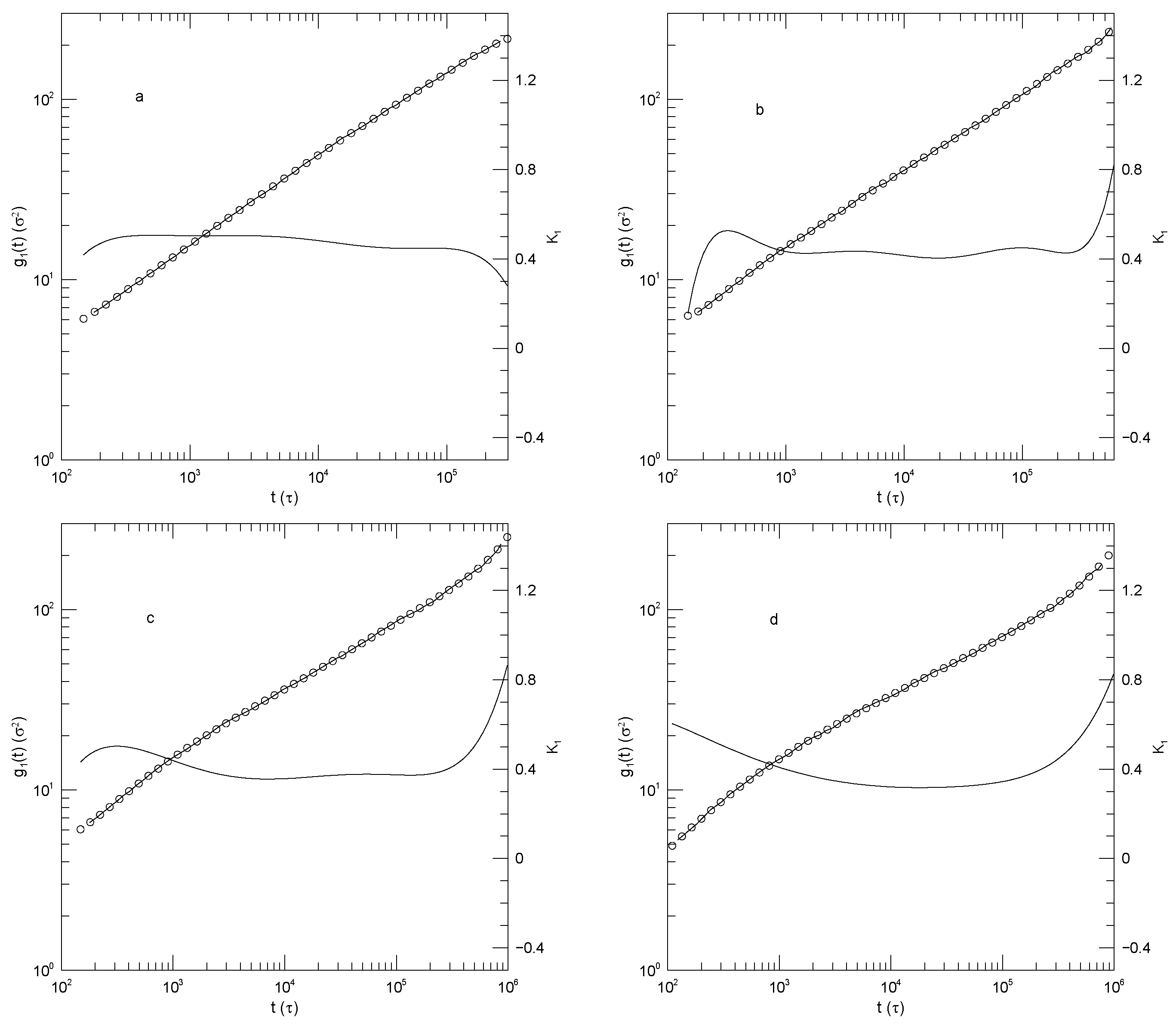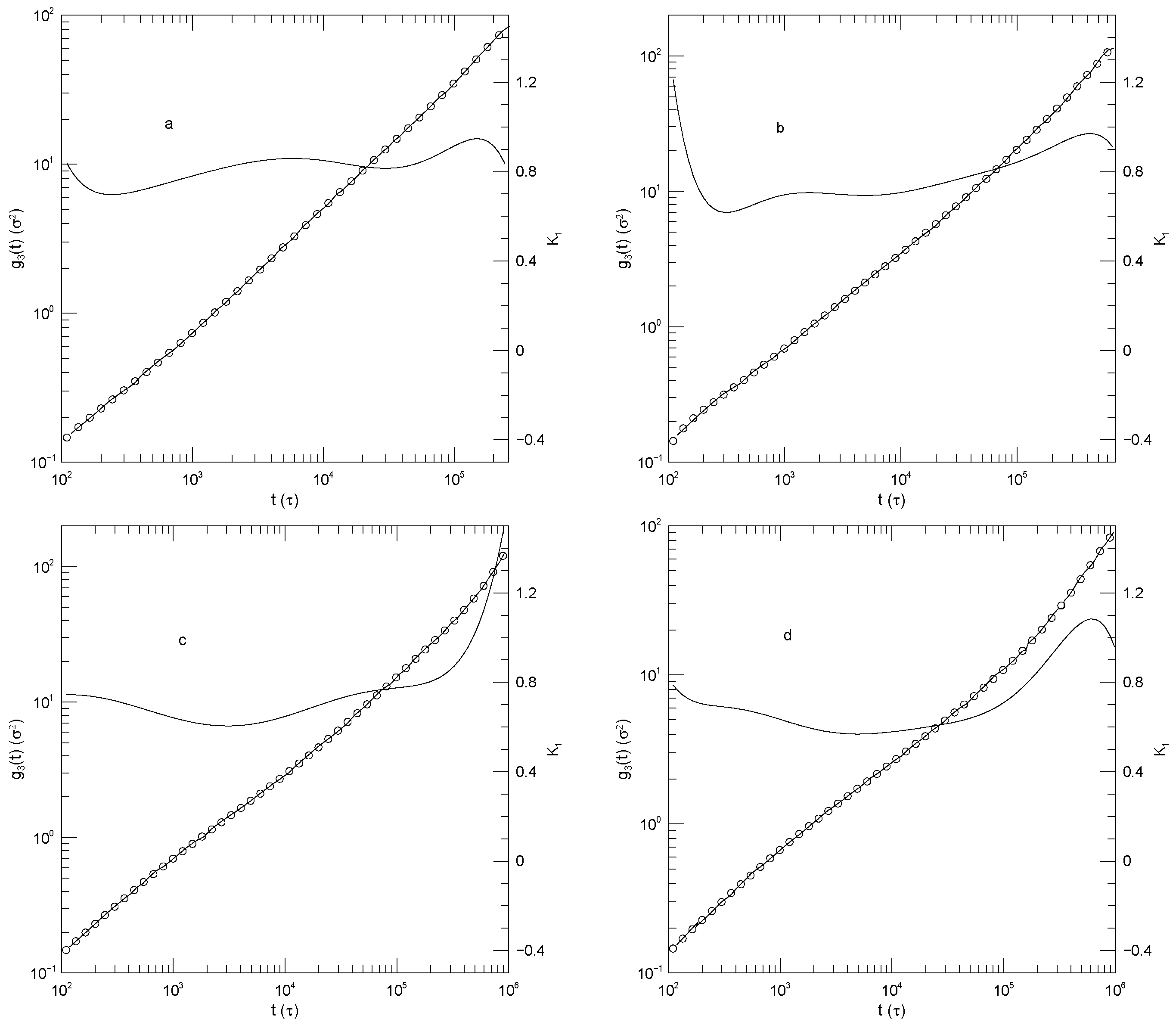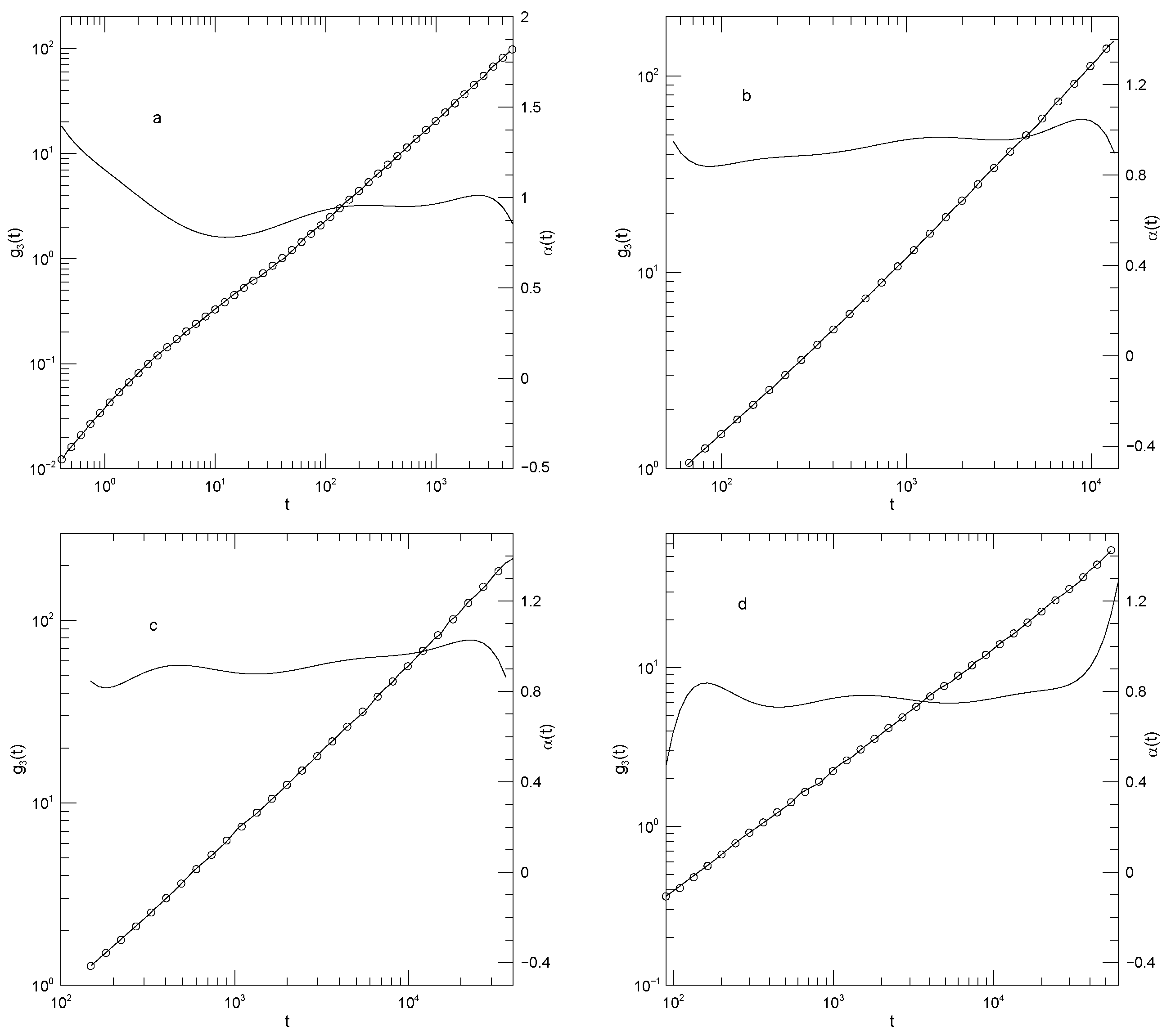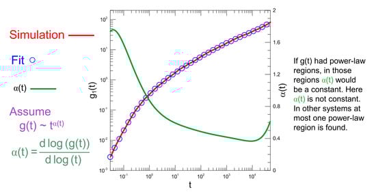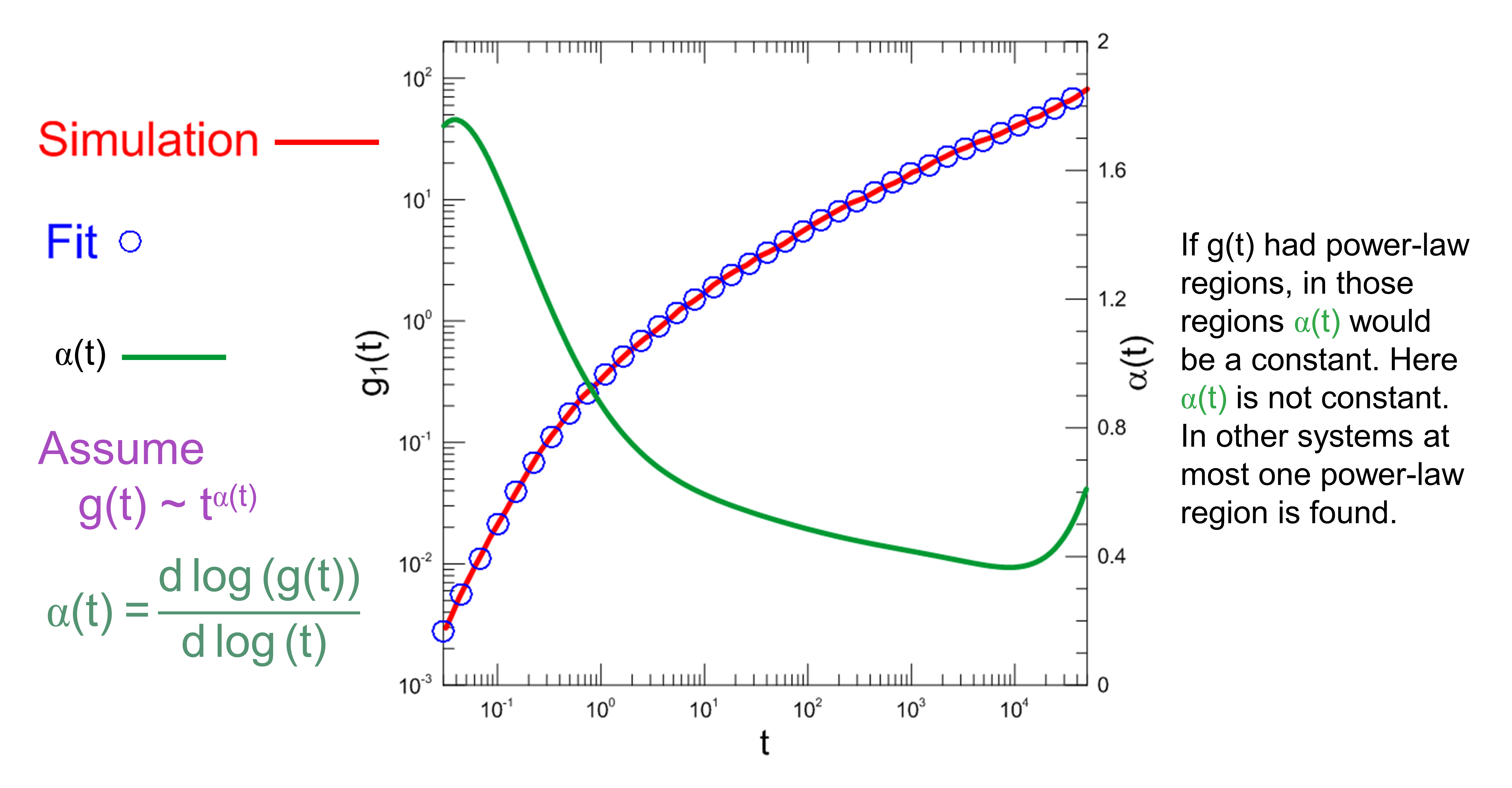 From our fits to log-log plots, we see that at intermediate times , , and have at most a single power-law regime, the time dependence of their logarithmic derivative at all other times being described by a curve of continuously changing slope.