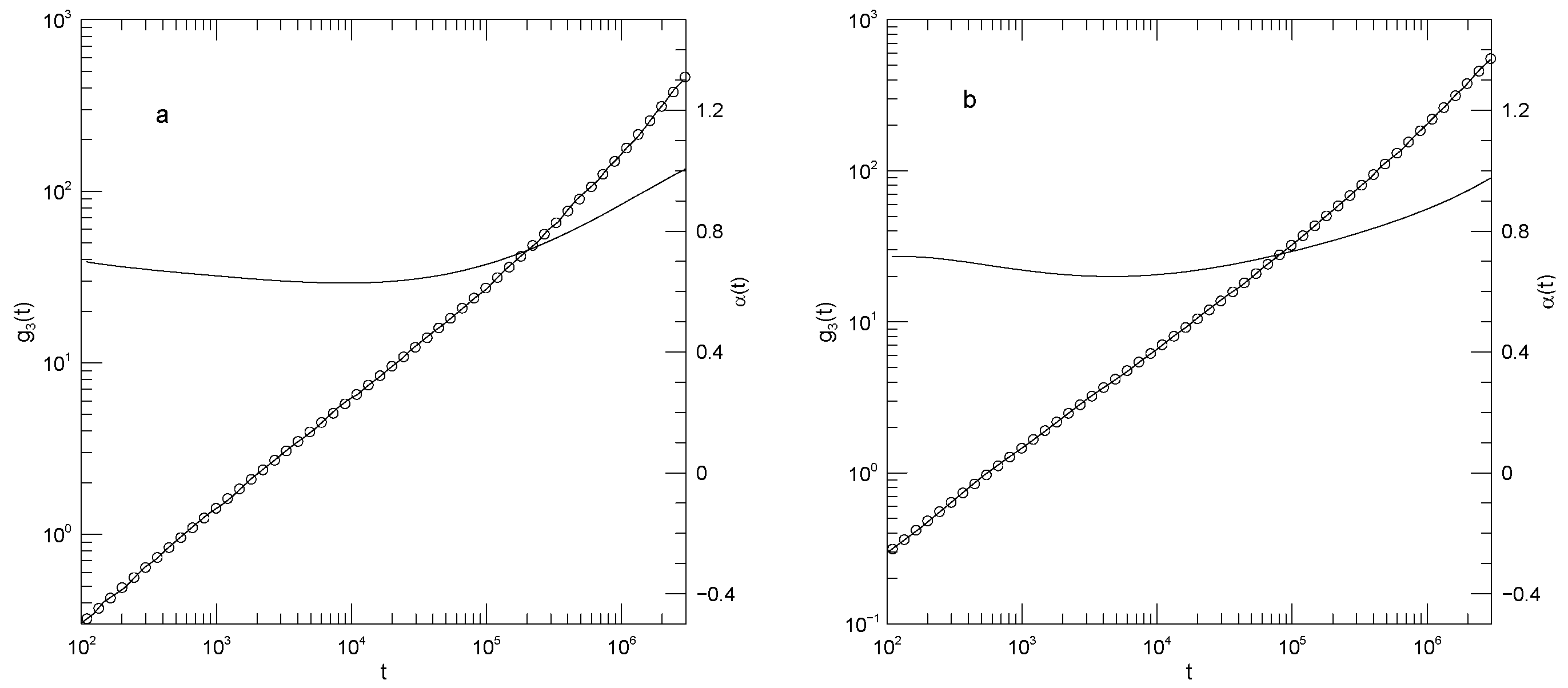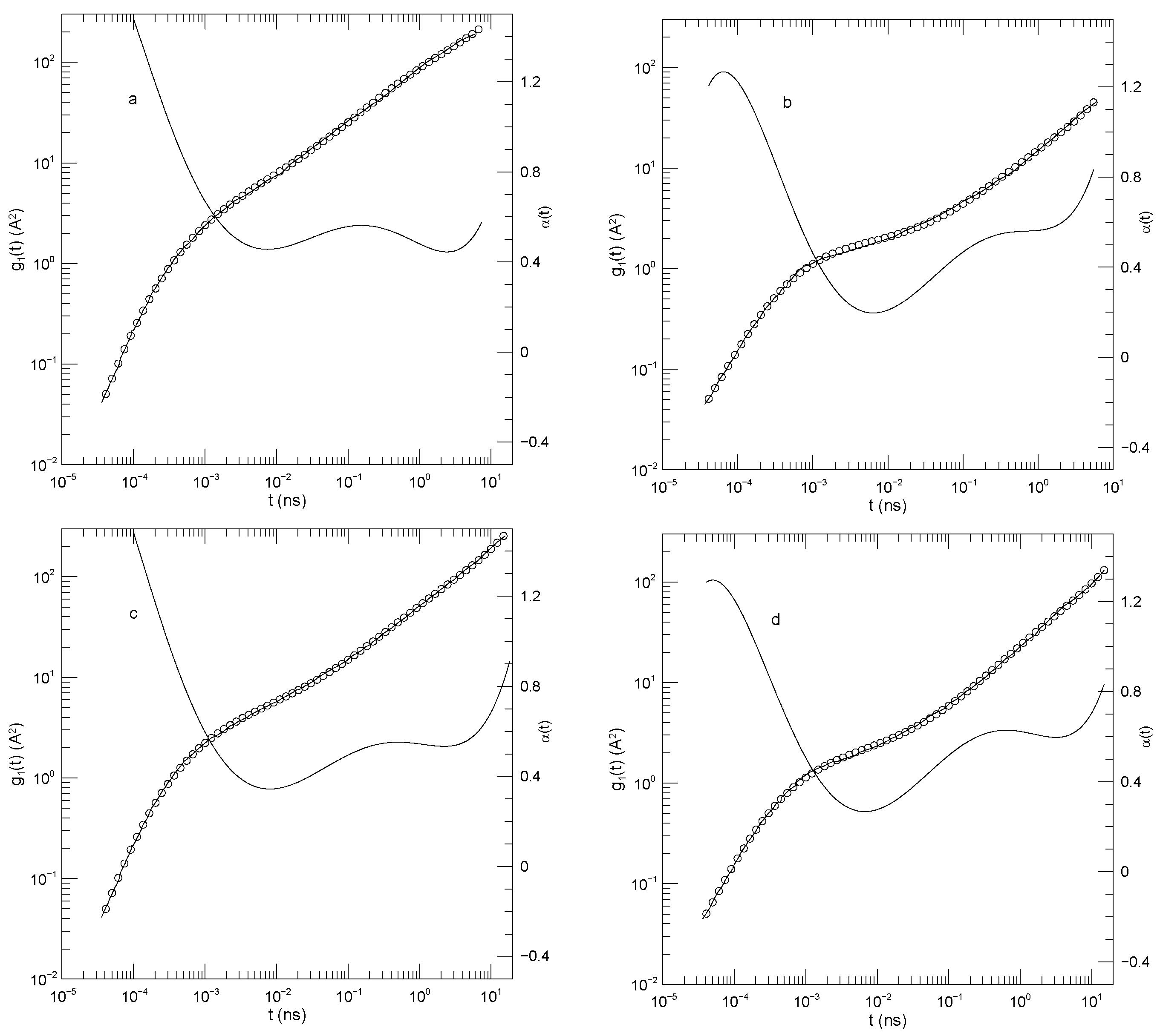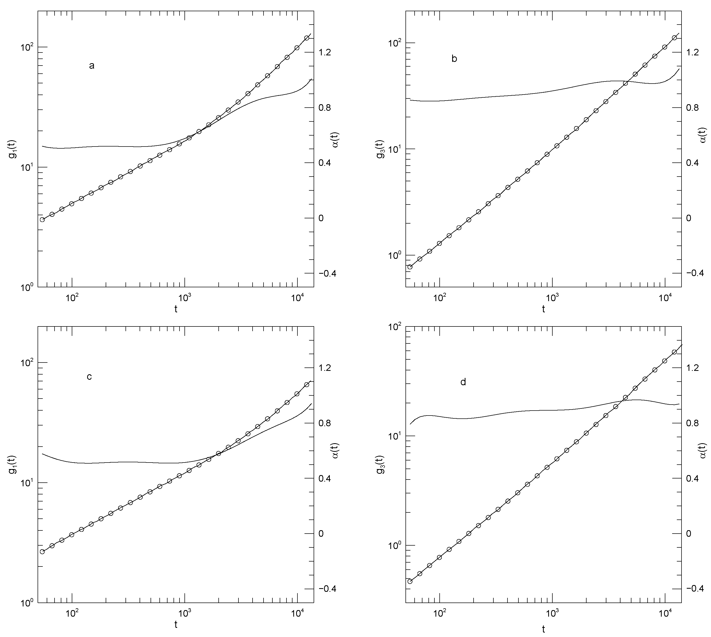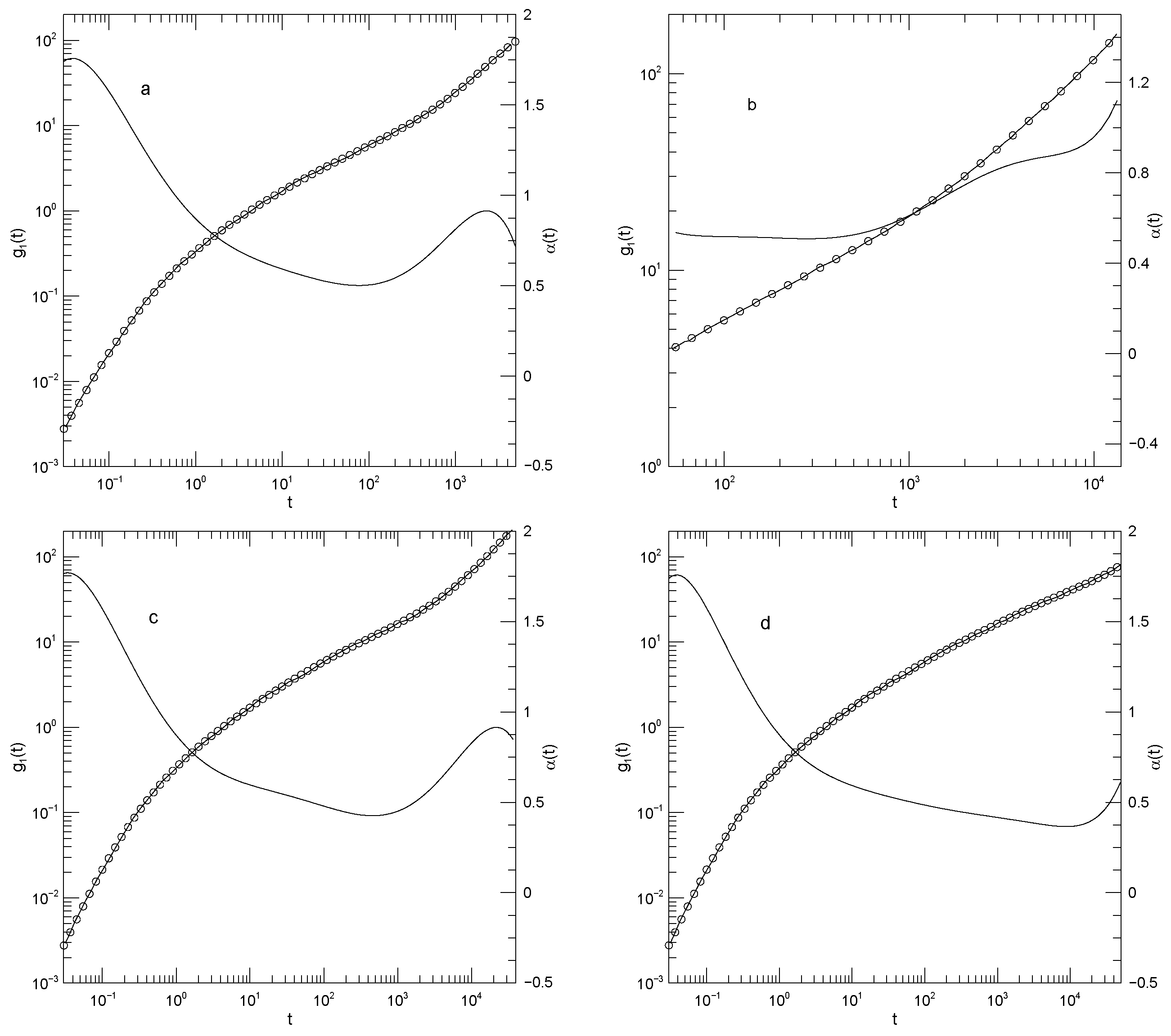 19] their Figures 3–5) is the prediction that the mean-square displacements follow a series of power laws, the power-law exponents depending on the time over which the mean-square displacements are determined, and the times at which the exponent changes from one value to the next being a central part of their theoretical analysis.