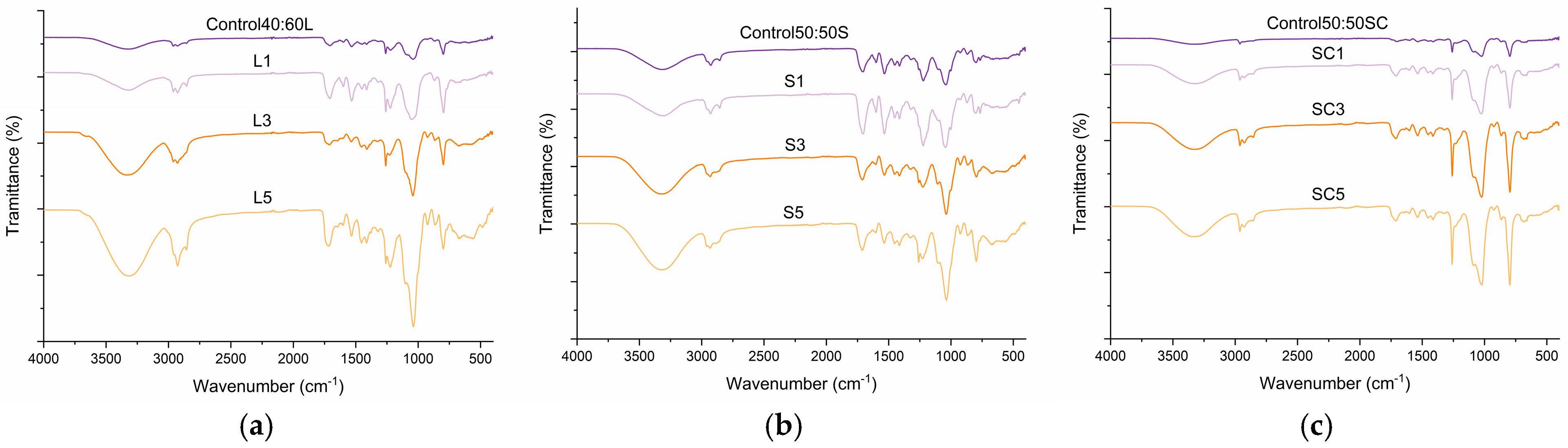 3.4.1. Physicochemical and Morphological Characterization of PU Foams