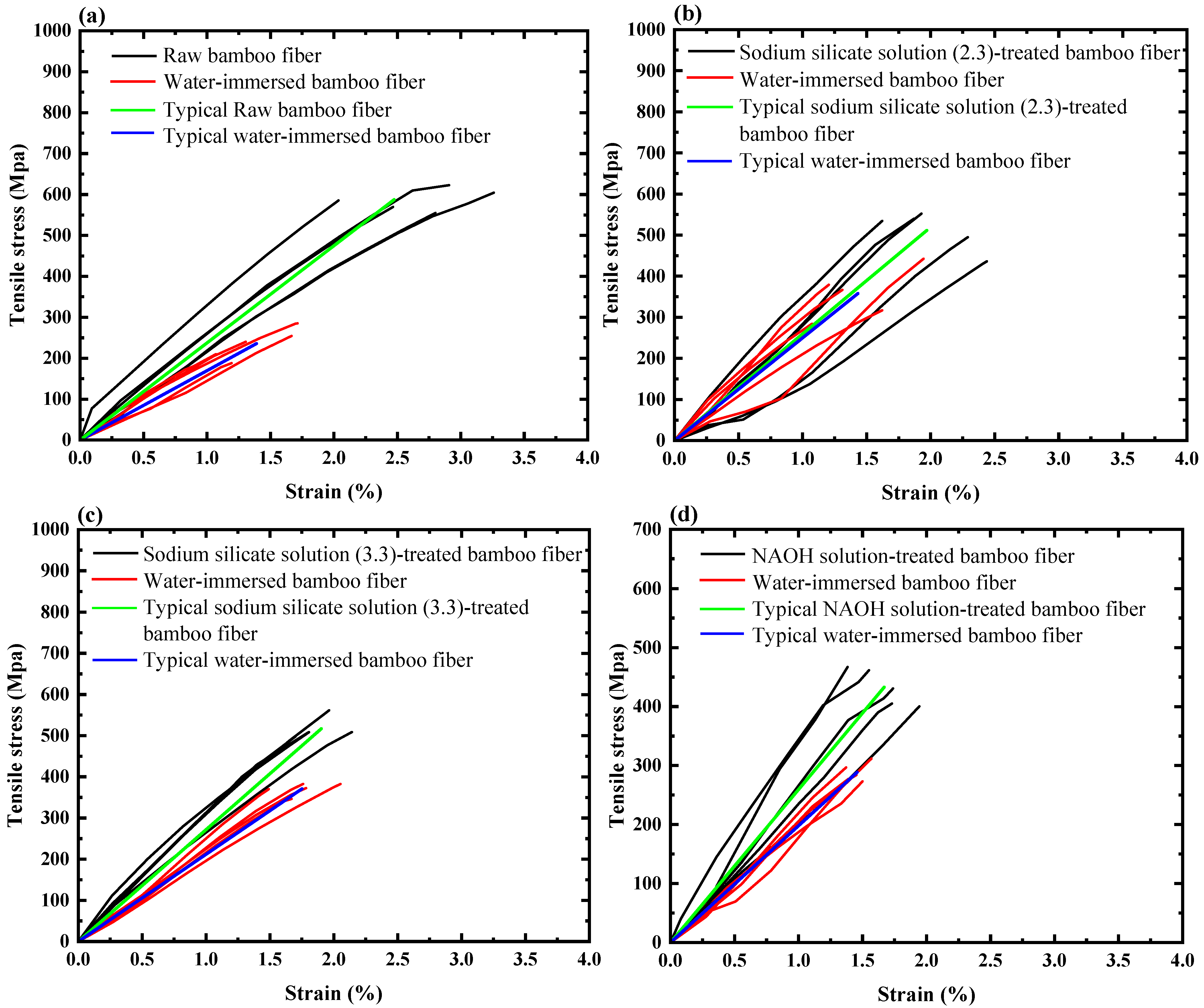 - Direct tensile tests indicate that XSBR-treated bamboo fibers exhibit the most favorable mechanical properties before water immersion, compared with raw bamboo fibers, with a 13.3% and 21.7% increment in tensile strength and Young’s modulus, respectively. After water immersion, mechanical indicators of raw bamboo fibers before water immersion are adopted as a benchmark; all treatment methods result in reduced tensile strength due to water absorption. Bamboo fibers treated with sodium silicate solution (modulus = 3.3) show the smallest reduction in tensile strength, with a value of 36.8%. For Young’s modulus, only the sodium silicate solution (modulus = 2.3) treatment maintains an increment of 4.5%, while all other methods result in a decrement. From the perspective of cost, environmental performance, and mechanical properties, sodium silicate solution is the most promising treatment method for bamboo fibers.
