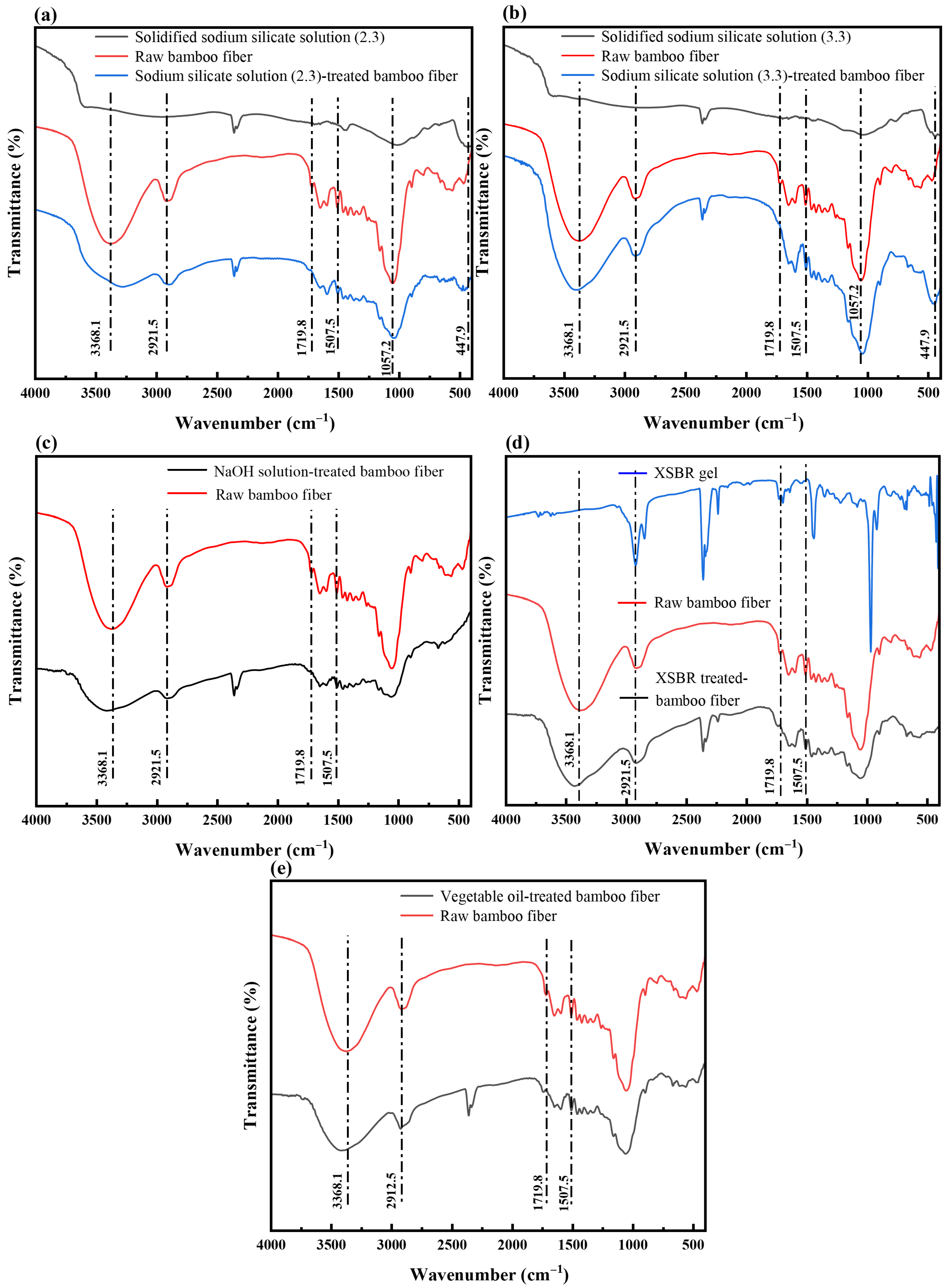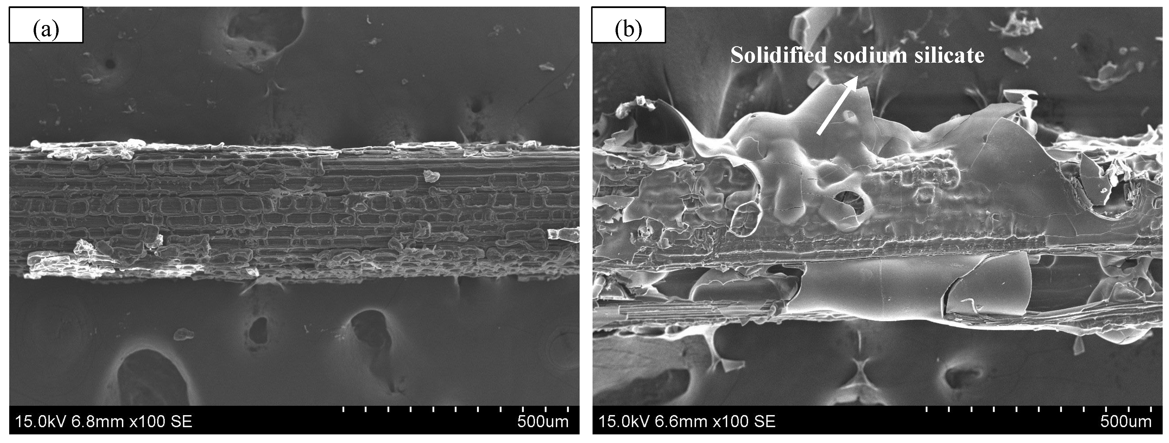 - Among the treatment methods, sodium silicate solution forms Si-O bonds during thermal curing, resulting in a densely crosslinked Si-O-Si solidified layer on the bamboo fiber surface. Based on the results of the tensile strength reduction rate, the solidified sodium silicate layer exhibits superior waterproofing performance compared to the XSBR gel layer.