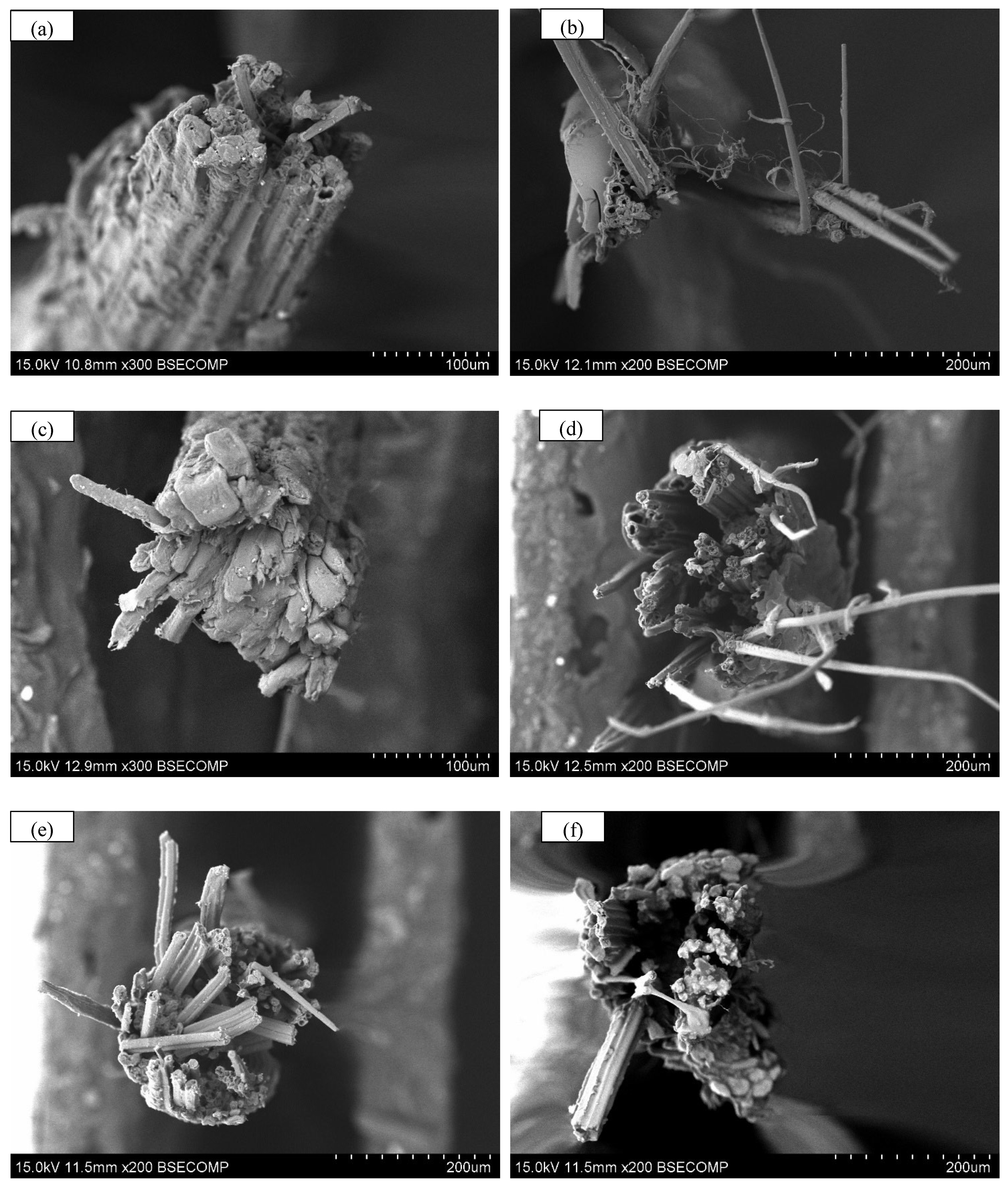 - The tensile fracture surface of raw bamboo fibers is relatively smooth without an evident necking phenomenon. In contrast, the tensile fracture surface of the treated bamboo fibers shows different lengths of fiber bundles and presents an umbrella-shaped explosive morphology. Mechanically, this is reflected in lower strain values of the treated bamboo fibers compared to the raw bamboo fibers.