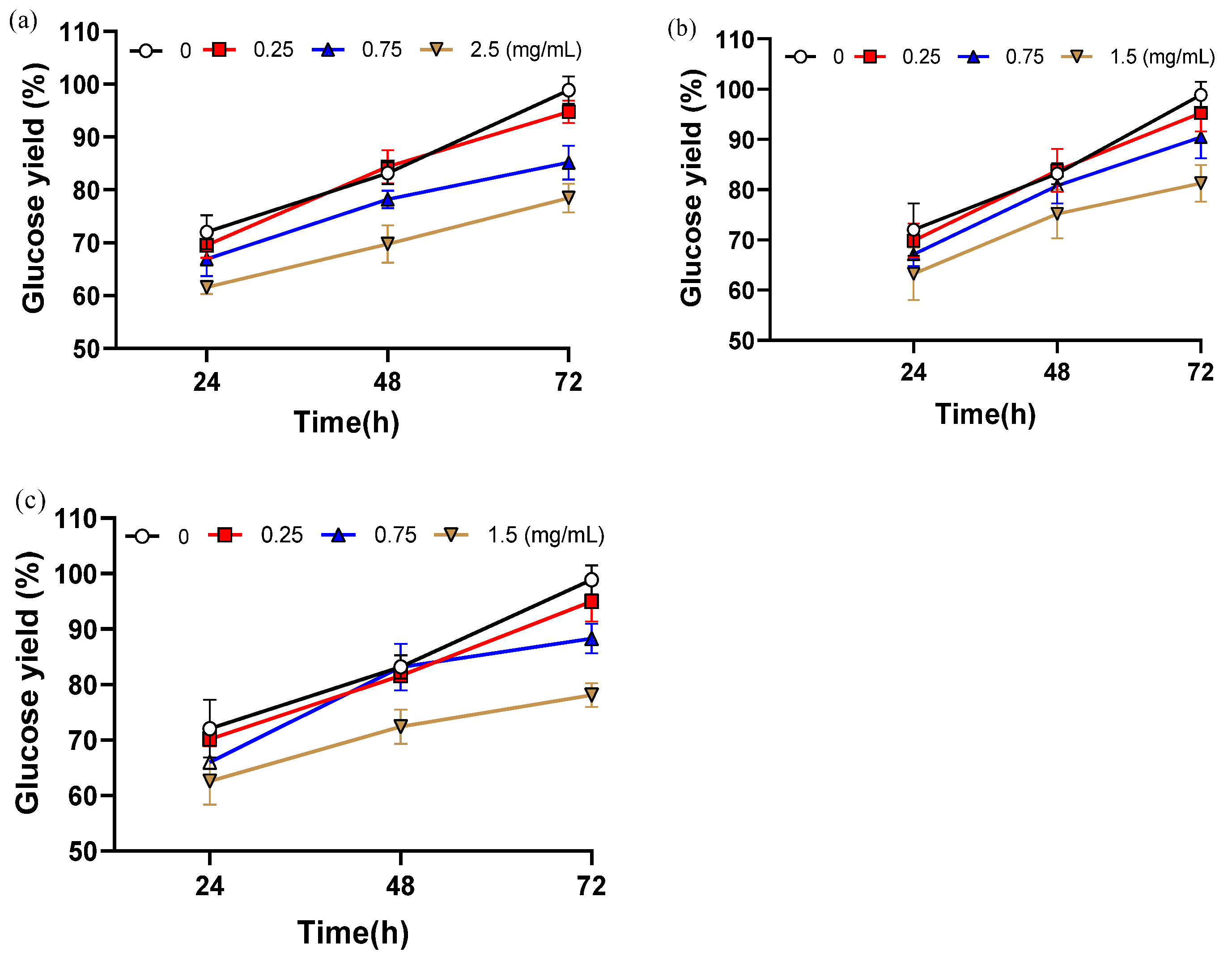 Figure 3, the addition of these compounds consistently reduced hydrolysis efficiency compared with the control, and the extent of inhibition increased with concentration, confirming their significant negative impact on cellulase activity. All three compounds exhibited clear concentration-dependent inhibition. After 72 h of hydrolysis, glucose yield decreased by 20.4% with 2.5 mg/mL vanillin, by 20.8% with 1.5 mg/mL syringaldehyde, and by 17.6% with 1.5 mg/mL 2-carboxybenzaldehyde relative to the inhibitor-free control. The inhibitory effects are likely linked to structural features: the methoxy group (–OCH