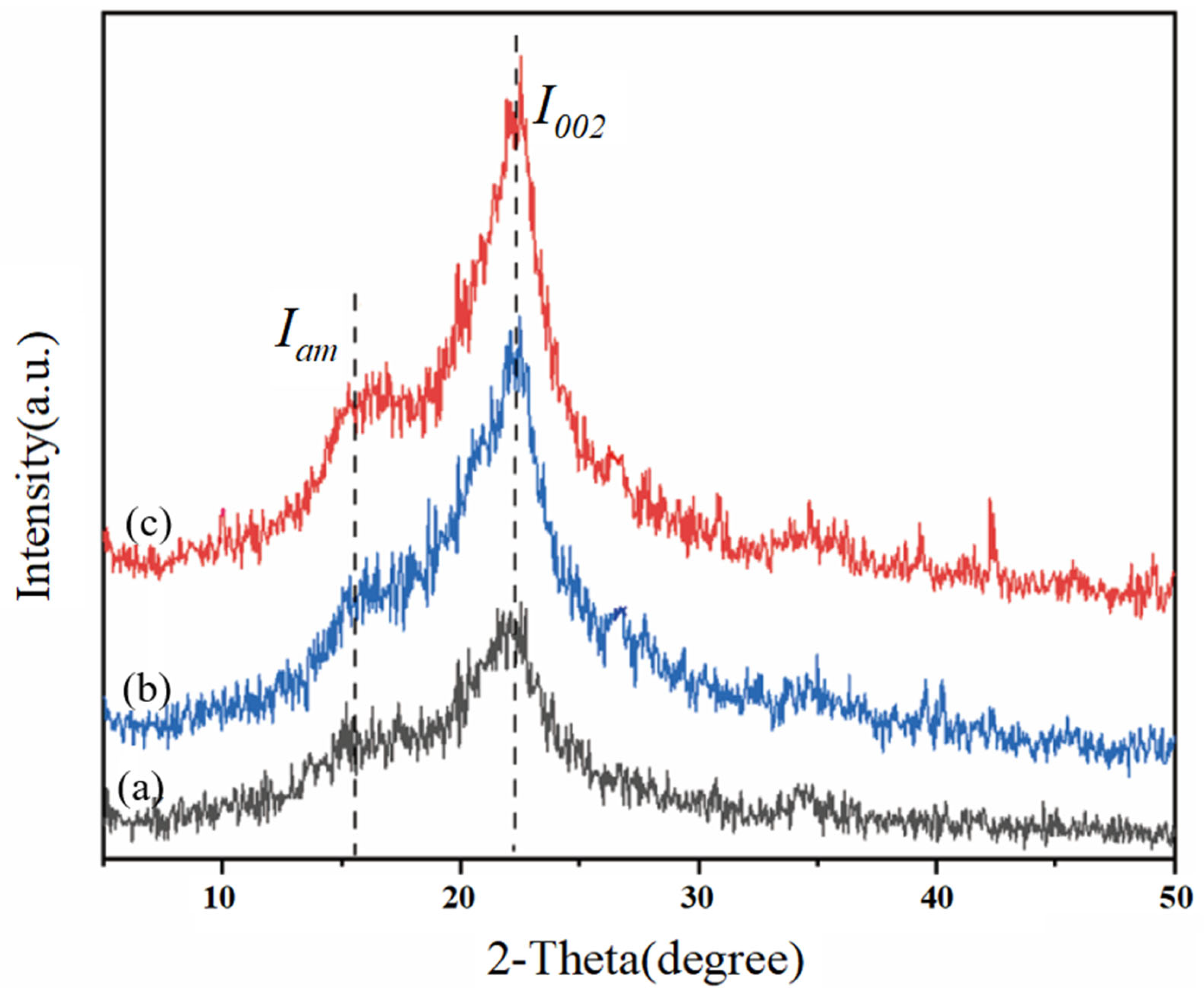 In the formula: CrI represents the X-ray crystallinity (%); Crystalline portion represents the X-ray crystallinity index (%); I002 is the maximum diffraction intensity of the lattice, that is, 2θ ≈ 22.3°; Iam is the scattering intensity of the background diffraction in the amorphous region, that is, 2θ ≈ 16.15°.