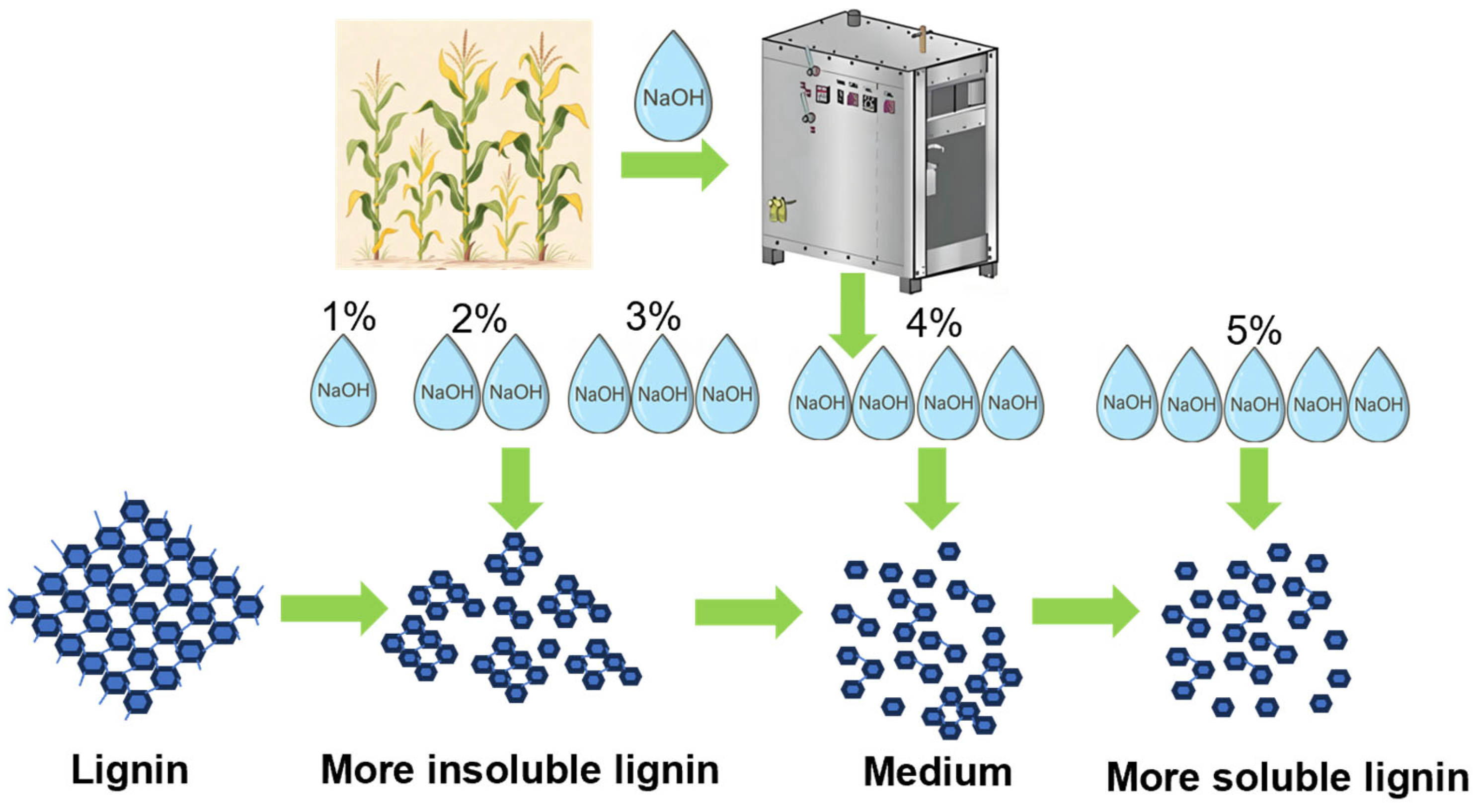 13]. Traditional high-concentration alkali (12 wt%, 12 g NaOH per 100 g dry biomass) treatment can achieve a lignin removal rate of 60–80% [