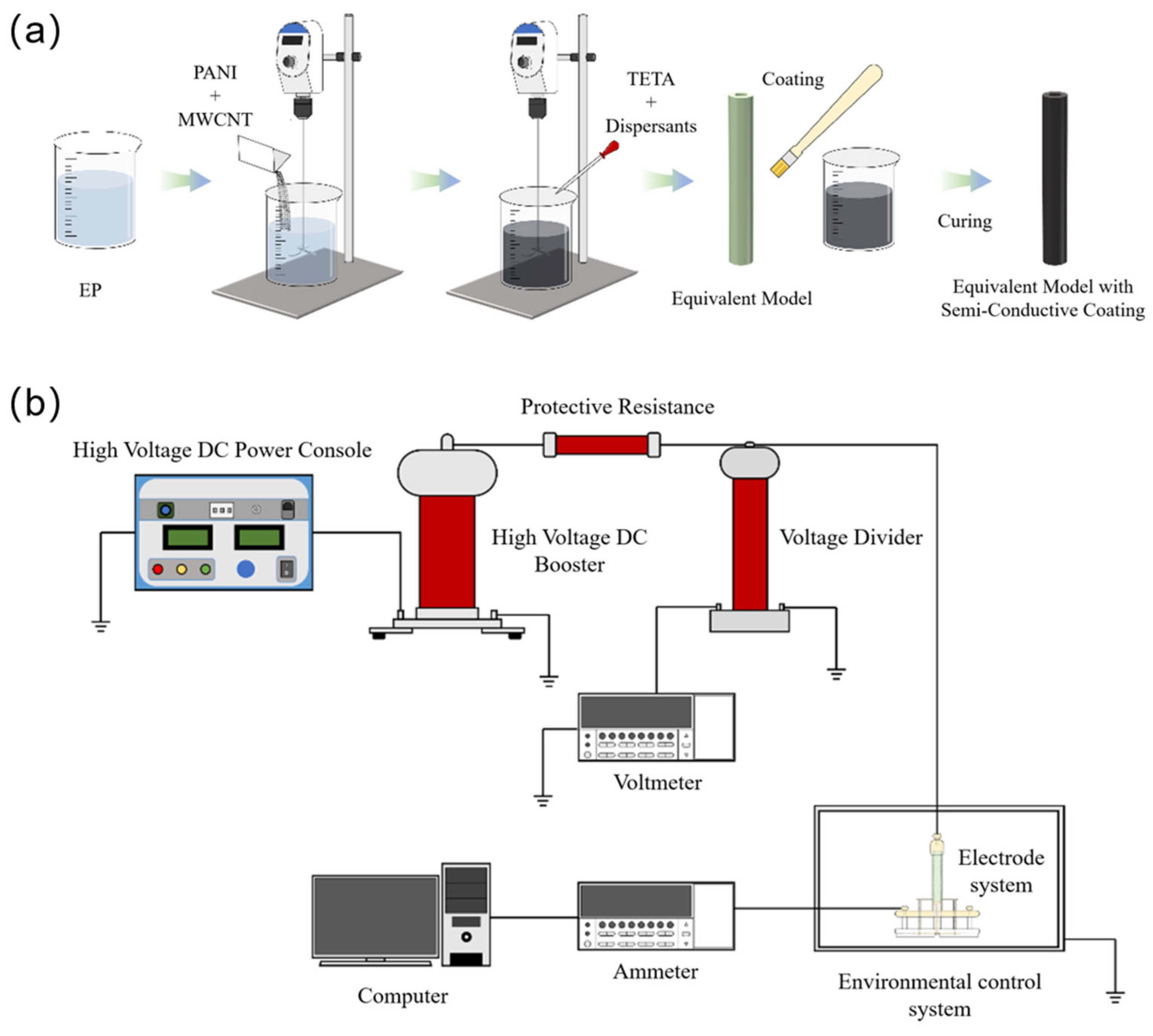 12], which was successfully developed in the early stage of the research group, and which has the potential of electric field modulation. The semi-conductive coatings with different dispersion states of conductive fillers were obtained by modulating the type and amount of dispersant. Based on the equivalent resistance test platform, the suppression effect of the distribution characteristics of the conductive fillers in the semiconducting coatings on the nonlinear variation in resistance and the interfacial adhesion strength of the epoxy sleeve were evaluated. This study aims to provide theoretical basis and experimental support for the optimization of the preparation process of high-performance MWCNTs/PANI semiconducting coatings, which will ultimately serve to improve the measurement accuracy and operational stability of key equipment such as high-voltage DC voltage dividers.