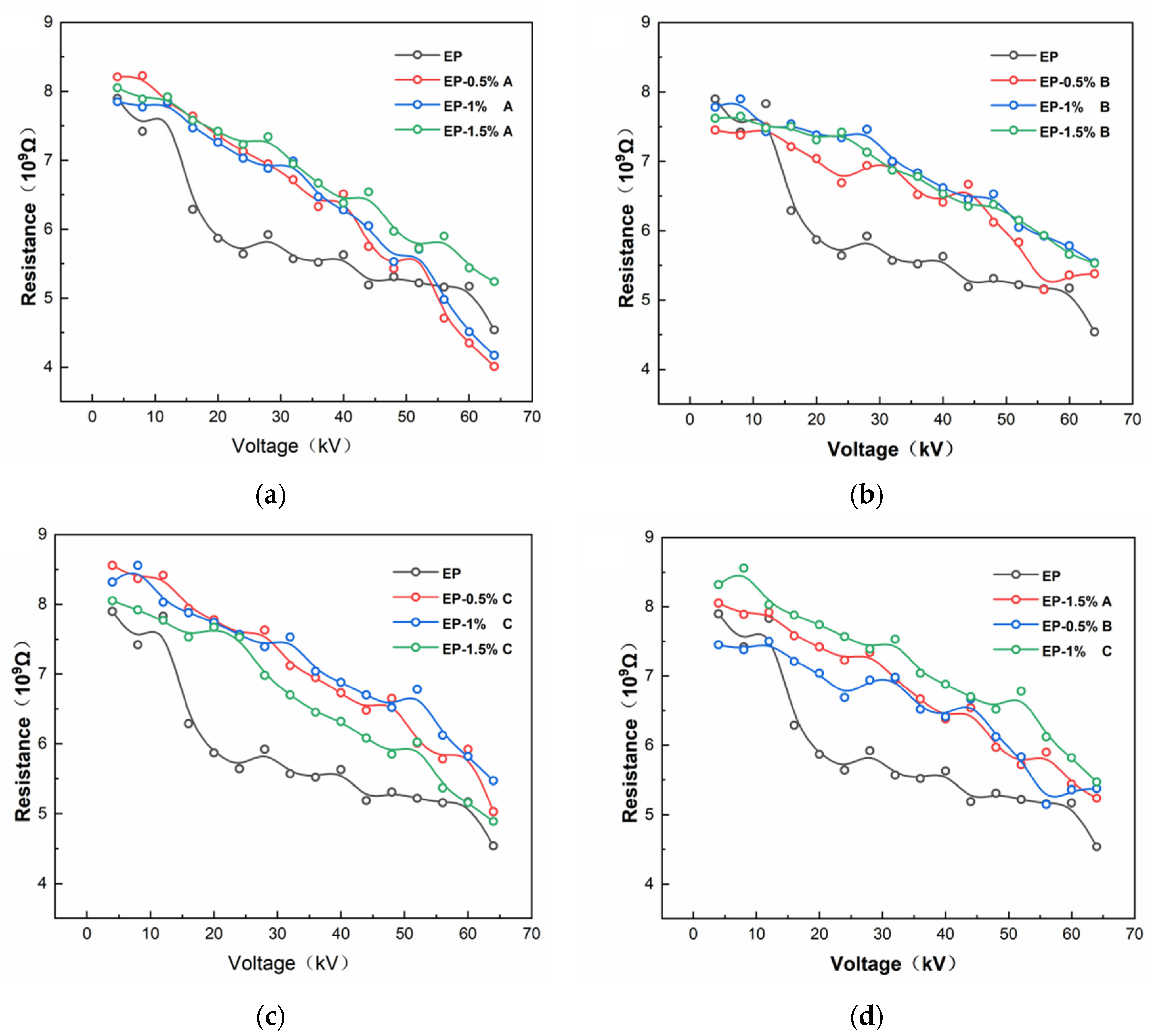 Figure 3, the equivalent resistance of the micro models with different dispersant types and dosages were measured using the equivalent resistance test platform, respectively, and the test voltage interval was 4–64 kV. It can be seen that the equivalent resistance of the samples showed a decreasing trend with the increase in the applied voltage level. Among them, the variation in equivalent resistance with voltage for EP samples is 42%. The dispersant can significantly affect the stability of the equivalent resistance by regulating the dispersion state of MWCNT and PANI. After adding the wetting dispersant, as shown in