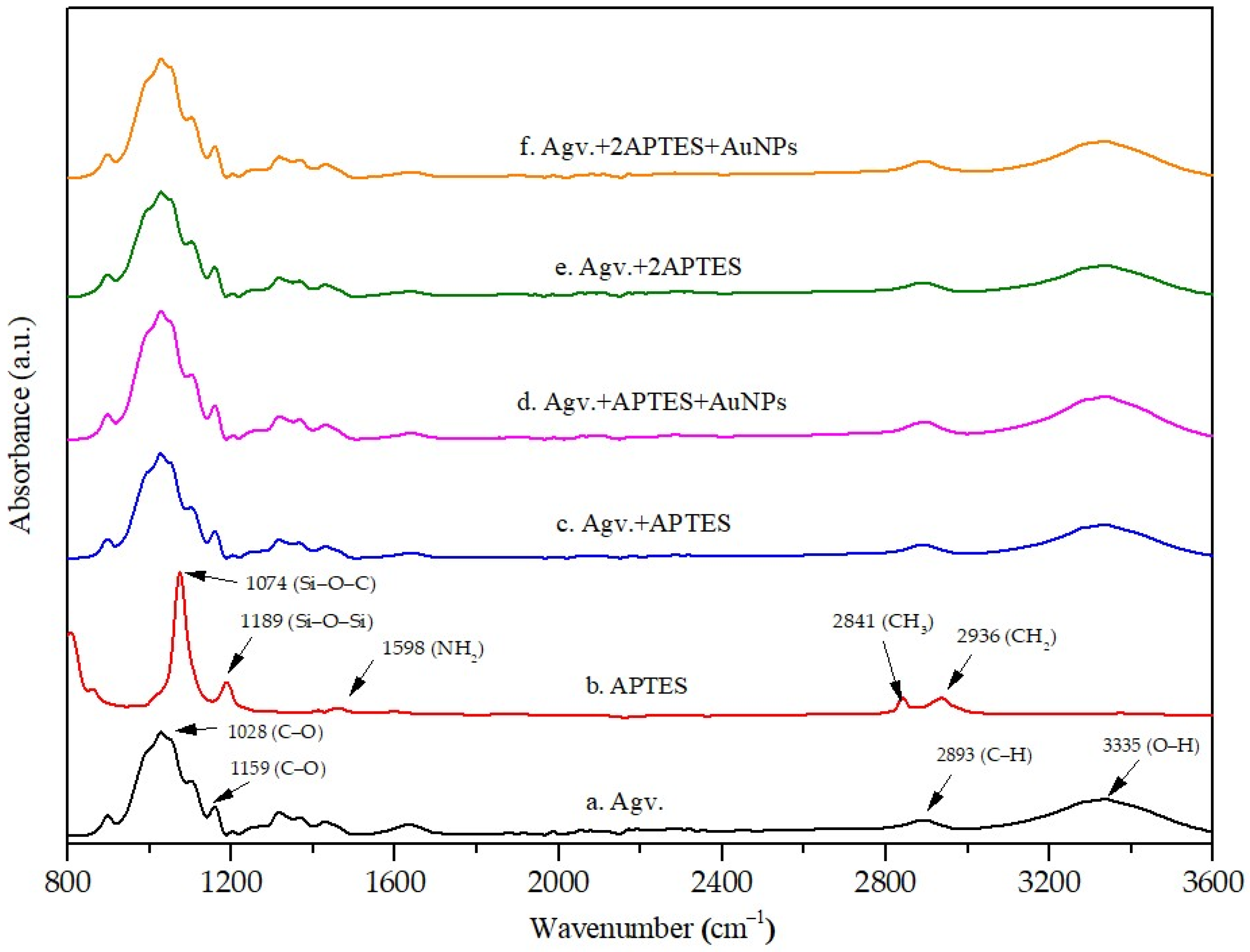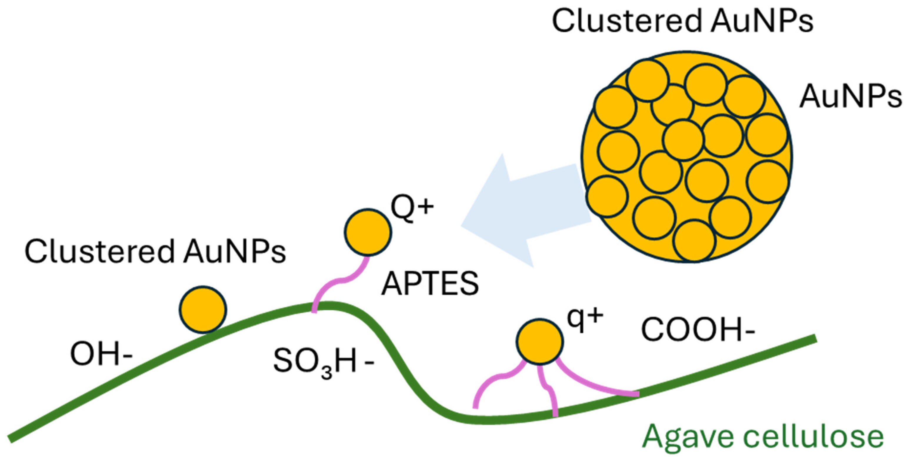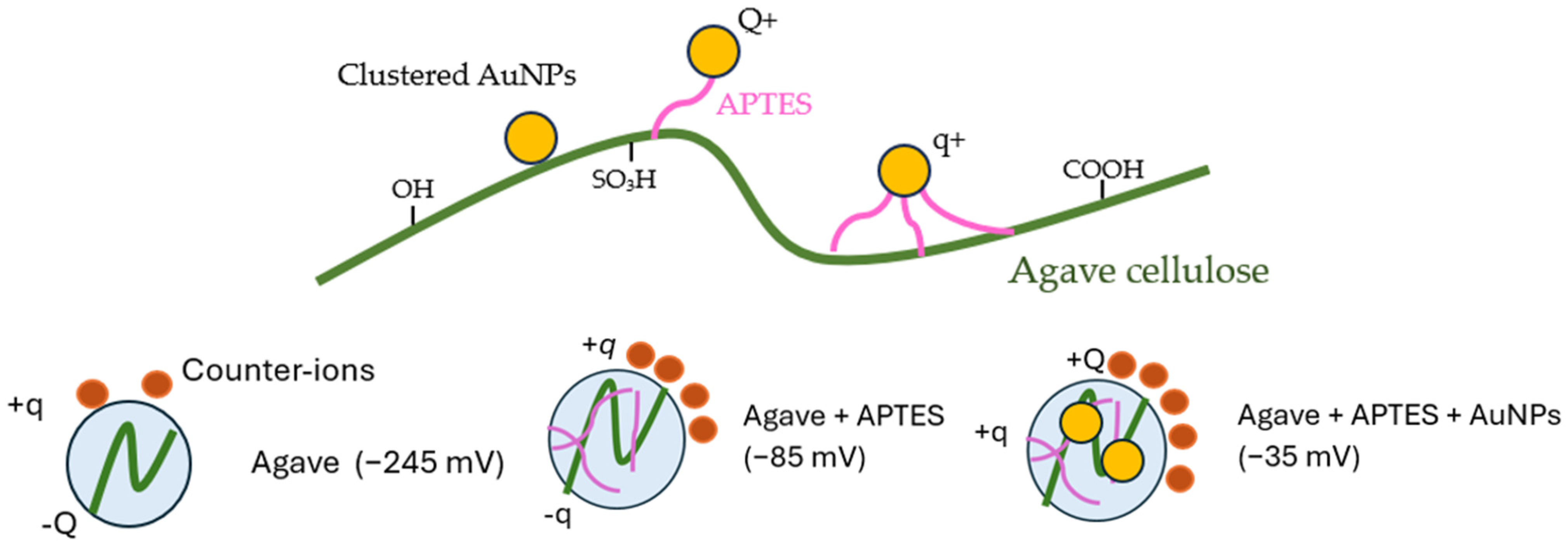 | Agv. + APTES + AuNPs | −141 | −35 | APTES partially neutralizes the negative charges on citrate-coated AuNPs and facilitates their immobilization on cellulose, resulting in an almost neutral surface [43]. |