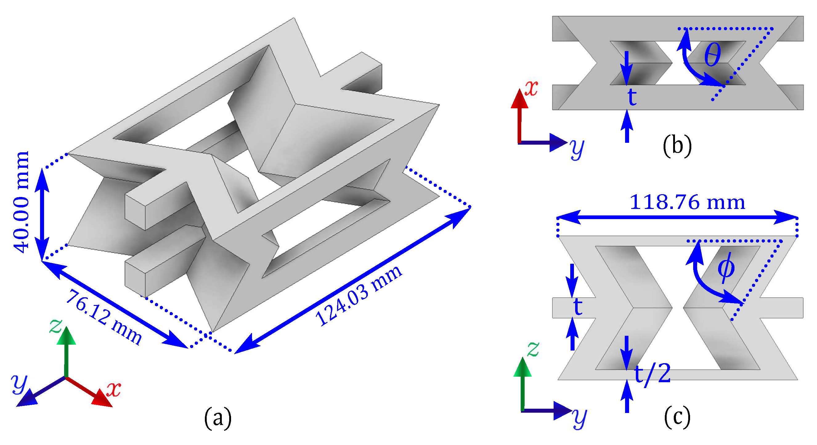 - Valle, R.; Pincheira, G.; Tuninetti, V.; Garrido, C.; Treviño, C.; Morales, J. Evaluation of the Orthotropic Behavior in an Auxetic Structure Based on a Novel Design Parameter of a Square Cell with Re-Entrant Struts. Polymers 2022, 14, 4325. [Google Scholar] [CrossRef]