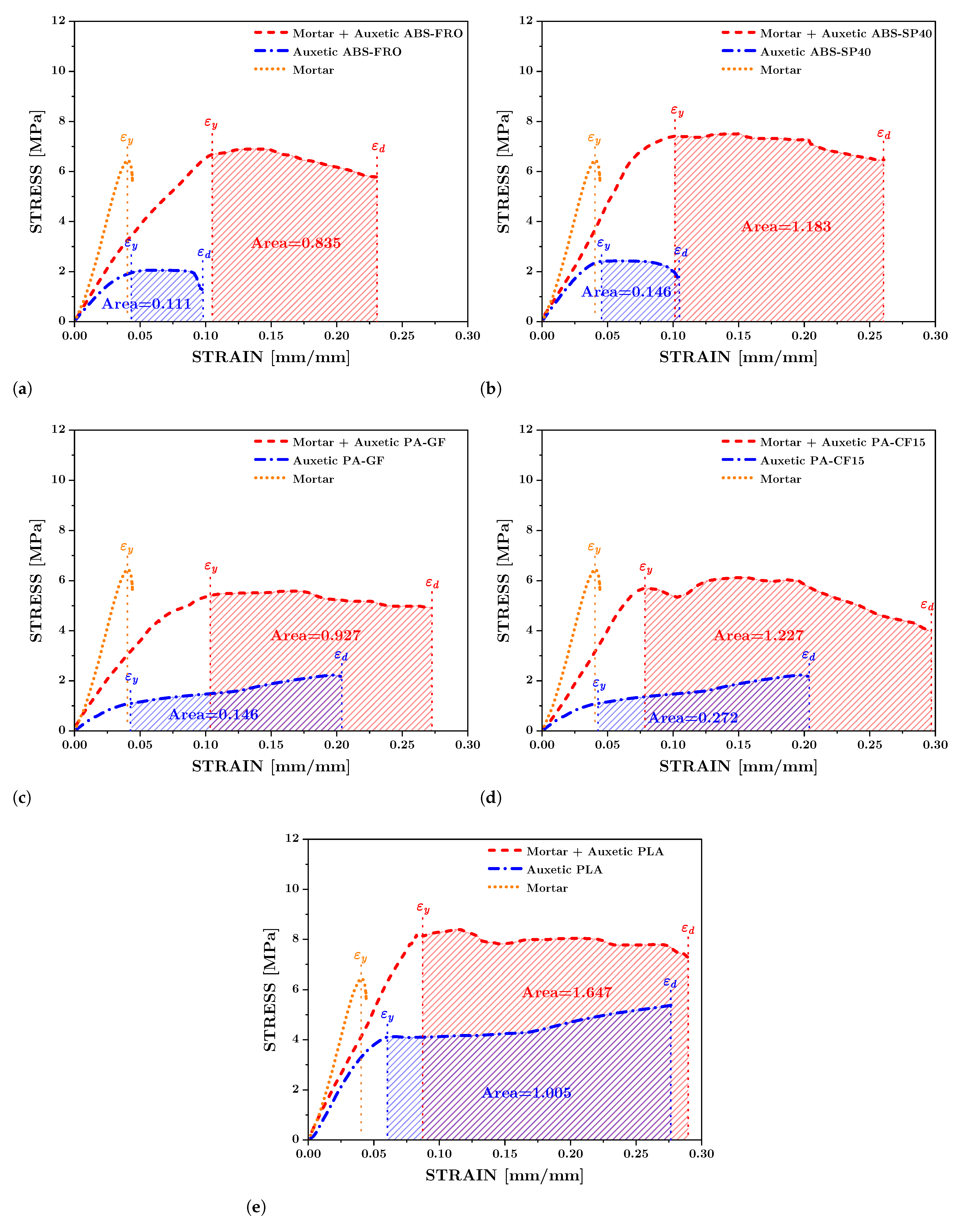 - While plain mortar exhibited brittle failure at 4.4% strain, the auxetic composites demonstrated superior ductility, achieving failure strains between 23% and 30%. This confirms that the auxetic core effectively delays catastrophic failure.