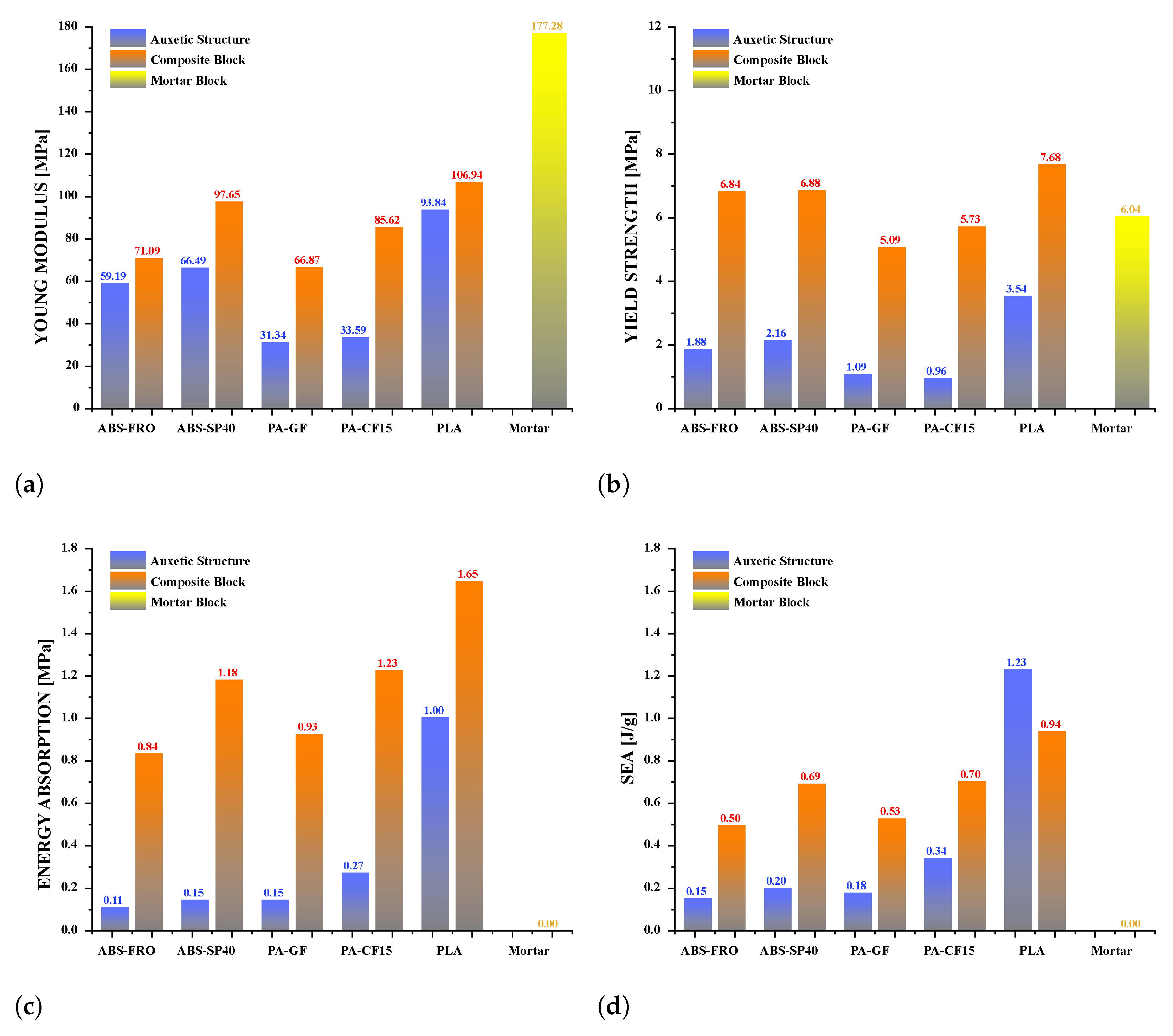 - The inclusion of auxetic structures significantly enhanced the energy dissipation capacity of the mortar. The most effective reinforcement was the -based structure, which achieved an energy absorption of 1.56 MPa, representing a 78% increase compared to plain mortar.