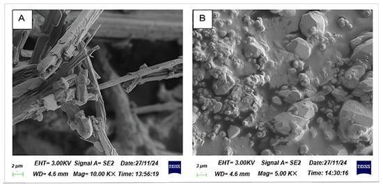 The surface morphology of bioflocculants Kp1 and Mg1 was evaluated and Kp1 appeared white (Kp1) in colour, whereas Mg1 was a light brown powder. Moreover, bioflocculant Kp1 displayed a fibrous and irregular structure across all magnifications, suggesting a predominantly amorphous architecture consistent with polymeric or organic bioflocculants (Figure 1A). This fibrous morphology is indicative of its high polysaccharide content and reflects its potential to form an extended network conducive to effective particle entrapment in flocculation processes []. Mg1 illustrated a distinctly granular and crystalline surface morphology, suggesting the presence of structured mineral phases, corroborating its lower protein and polysaccharide content but a higher fraction of diverse biomolecules, potentially inclusive of mineral-associated components (Figure 1B) [].