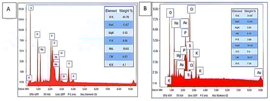 Figure 2 demonstrates the detailed elemental mass ratios of the purified bioflocculants Kp1 and Mg1. The most predominant trace element in bioflocculant Kp1 was niobium (Nb) with 21%, followed by phosphorus (P) and oxygen (O2) with 20% and 16%, respectively. Potassium (K) and magnesium (Mg) were the least abundant at 10% (Figure 2A). In contrast, bioflocculant Mg1 was dominated by chlorine (Cl), accounting for 17%, whereas Mg and sodium (Na) exhibited the lowest proportions, with 5% and 8%, respectively (Figure 2B). The dominance of Nb and P as the primary components in Kp1 suggests that this bioflocculant contains a significant proportion of elements commonly associated with enhanced flocculating abilities, owing to their chemical reactivity and capacity to form stable complexes []. The presence of Nb in Kp1 aligns with the findings of Li et al. [] who reported that Nb-enriched bioflocculants exhibit superior performance in heavy metal removal from wastewater. However, the relatively high Nb content detected in Kp1 may partly reflect potential contamination or signal interference. Possible sources include residual metallic particles within the SEM chamber, scattering from the gold coating, or elemental contributions from the aluminum stub used for mounting. The abundance of P may contribute to strengthening the polymeric network in Kp1, thereby promoting efficient particle aggregation. Conversely, the elemental profile of Mg1, characterized by the dominance of Cl− and the lower proportions of Mg and Na, indicates a distinct compositional pattern. The presence of sulphur within Mg1 further suggests its potential suitability for specialised flocculation processes, such as metal recovery or bioremediation, consistent with the observations of Wang et al. []. The relatively high oxygen content in both bioflocculants underscores the role of the hydroxyl group in bioflocculation, as these are commonly involved in hydrogen bonding and particle capture.