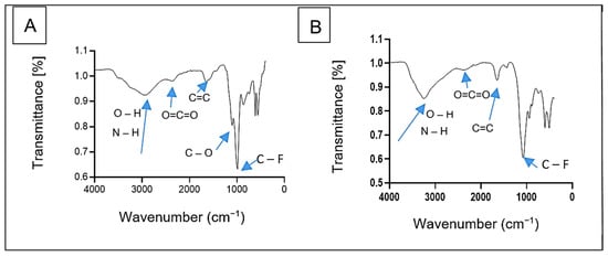 The FTIR spectra of bioflocculants Kp1 and Mg1 revealed distinct functional groups critical to their chemical structure and functionality (Figure 3). The spectra were recorded using a fixed resolution of 4 cm−1, ensuring consistent and reliable peak identification across samples. Bioflocculant Kp1 displayed characteristic peaks at 2944 cm−1, 2371 cm−1, 1657 cm−1, 1120 cm−1, and 1000 cm−1 (Figure 3A). These peaks were, respectively, attributed to overlapping O–H and N–H stretching vibrations, O=C=O stretching, C=C stretching, as well as C–O and C–F stretching vibrations. Similarly, bioflocculant Mg1 exhibited absorption bands at 3260 cm−1, 2388 cm−1, 1648 cm−1, and 1093 cm−1 (Figure 3B). These correspond to overlapping O–H and N–H stretching vibrations, O=C=O stretching, C=C stretching, and C–O stretching vibrations.
