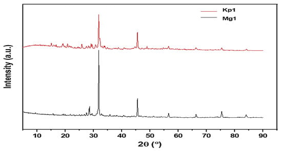 X-ray diffraction (XRD) analysis was conducted to elucidate the crystalline and structural characteristics of the bioflocculants Kp1 and Mg1 (Figure 4). The XRD pattern of Kp1 exhibited two prominent diffraction peaks at 2θ = 33° and 46° (Figure 4), which can be accurately indexed to the (104) and (200) crystal planes of calcium carbonate (CaCO3) in its calcite phase (JCPDS 05-0586). These sharp reflections confirm the presence of crystalline mineral residues, likely incorporated during bioflocculant biosynthesis or through microbial mineralization processes. In addition, broad diffraction features observed at 2θ = 14°, 18°, 26°, 48°, 58°, 68°, 77°, and 85° indicated the presence of amorphous organic macromolecular components, such as polysaccharides and proteins, which are typical of biopolymeric matrices lacking long-range order. The XRD pattern of Mg1 displayed distinct sharp peaks at 2θ = 28°, 32°, and 46° (Figure 4), corresponding to the (111), (200), and (220) planes of magnesium oxide (MgO) (JCPDS 45-0946), confirming the formation of a well-defined crystalline inorganic phase. Additional broad halos at 2θ = 57°, 67°, 76°, and 84° further suggest the coexistence of amorphous organic regions intertwined with these crystalline domains. Collectively, the XRD profiles of Kp1 and Mg1 demonstrated their semi-crystalline nature, comprising both ordered crystalline structures and disordered amorphous phases. The coexistence of these two structural domains is functionally advantageous: the crystalline regions impart mechanical strength and structural rigidity, while the amorphous regions contribute flexibility to the biopolymer matrix. Although no direct mechanical testing was performed in this study, the diffraction data implies that this semi-crystalline configuration could enhance the bioflocculants’ stability and durability. This observation aligned with the findings of Maćczak et al. [], who reported that bioflocculants with mixed crystalline–amorphous architectures exhibit improved mechanical integrity due to synergistic reinforcement between their ordered and disordered molecular phases.
