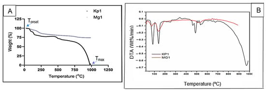 TGA (A) and DTA (B) spectra of bioflocculants Kp1 and Mg1.