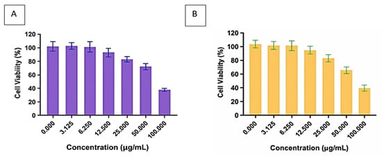 Figure 6 illustrates the cytotoxic effects of the bioflocculants Kp1 and Mg1 on CACO-2 cell lines, revealing a clear concentration-dependent relationship. As the concentrations of both bioflocculants increased, cell viability significantly decreased, indicating potential cytotoxicity at higher doses. Specifically, cell viability for Kp1 declined from 93.18% at 3.13 µg/mL to 39.36% at 100 µg/mL, while Mg1 showed a similar trend, with viability dropping from 98.25 to 38.97% across the same concentration range. These results imply that low concentrations (≤3.13 µg/mL) of Kp1 and Mg1 exhibit minimal cytotoxicity, maintaining over 90% cell viability. This is particularly relevant for wastewater treatment applications, where bioflocculants are typically effective at low dosages to achieve high flocculation efficiency []. Thus, at the operational concentrations commonly employed in wastewater treatment, Kp1 and Mg1 are likely to be biocompatible and environmentally safe, minimising ecological and human health risks. However, caution should be exercised at elevated concentrations, especially during large-scale production, handling, or accidental spillage, as cytotoxic effects may become significant.