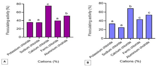 The effect of various cations on the %FA of the bioflocculant Kp1 (A) and Mg1 (B). The alphabets signify statistical significance at p < 0.05.