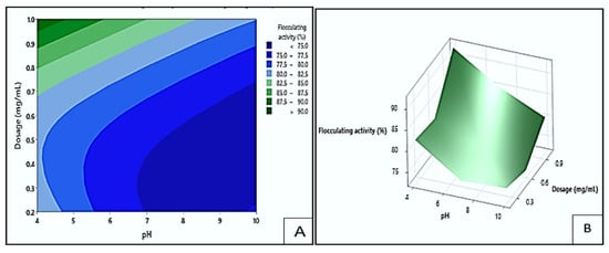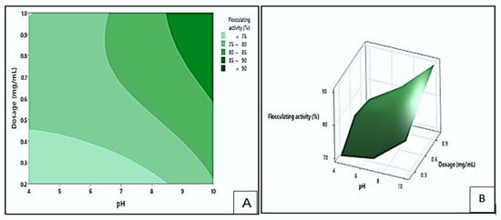 The effect of dosage and pH on flocculating activity by bioflocculant Mg1 is displayed in Figure 11. The darkest green area of the contour plot (A) indicated the area where the highest flocculating activity values exceeding 90% could be obtained. This could occur at the pH levels of 4.0 to 4.5 and dosage sizes between 0.95 and 1.0 mg/mL. The darkest blue area represented the lowest flocculation (<75%), which could be found at pH levels of 7 to 10 and dosage sizes ranging from 0.2 to 0.68 mg/mL. These findings showed that higher dosage ranges and acidic pH levels increased flocculating efficiency by maintaining optimal charge characteristics and increasing the number of active binding sites for particle interaction []. Agunbiade et al. [] similarly confirmed that higher bioflocculant dosages enhance flocculation by promoting particle bridging and aggregation.
