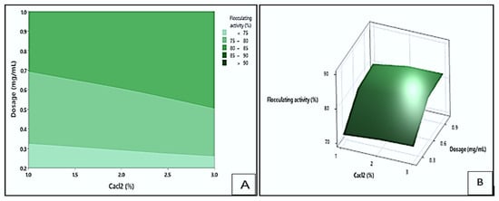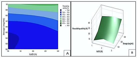Figure 9 shows the contour (A) and response surface (B) plots depicting the effect of dosage and CaCl2 concentration on the flocculating activity of the bioflocculant Kp1. The plots highlighted that the highest flocculating activity values (greater than 90%) could be obtained at the darkest green area. These optimal values could be achieved within a dosage range of 0.69 to 1.0 mg/mL and a CaCl2 concentration between 1.0 and 3.0% (w/v). The lowest flocculating activity (below 75%) is depicted by the lightest green area and could be obtained when the dosage ranged between 0.2 and 0.32 mg/mL, and the CaCl2 concentration maintained between 1.0 and 3.0% (w/v). These results implied that both dosage and CaCl2 concentration significantly influenced the flocculating activity of Kp1. The optimal combination of these parameters likely enhanced charge neutralisation and bridging between particles, promoting effective floc formation [].