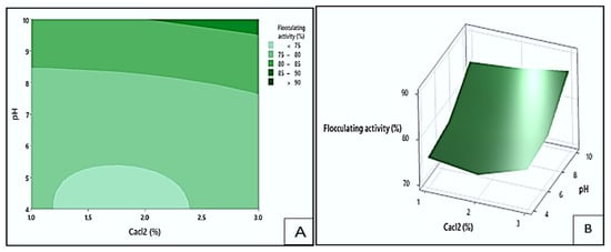 Figure 10 displays contour (A) and response surface (B) illustrating the impact of pH and CaCl2 concentration on the flocculating activity of Kp1. In the contour plot, the dark green area represented the area where the highest flocculating activity (>90%) could be obtained at pH levels between 9.5 and 10 and CaCl2 concentrations ranging from 2.1 to 3.0% (w/v). The light green region indicated the region with the lowest flocculation values (<75%). The lowest flocculation could be obtained at pH levels between 4.0 and 5.4 and CaCl2 concentrations between 1.2 and 2.4% (w/v). This suggested that the interplay between alkaline pH and high CaCl2 concentration positively contributed to flocculation efficiency. Under slightly alkaline conditions, Kp1 likely maintained optimal charge characteristics, promoting stronger interactions with colloids and improving floc formation. This finding aligns with the work of Srinivasan et al. [], who observed that the bioflocculant from K. pneumoniae exhibited high performance within a similar pH range. The calcium ions likely interacted with both the bioflocculant Kp1 and colloidal particles at optimal concentrations, stabilising flocs and facilitating particle aggregation. This observation agrees with the findings of previous studies [], which demonstrated that calcium ions promote charge neutralisation and bridging between bioflocculant polymers and suspended solids, thereby enhancing flocculation efficiency.