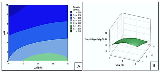 The contour (A) and surface plots (B), depict Kp1′s flocculating activity as a function of the interaction between pH and CaCl2 concentration.