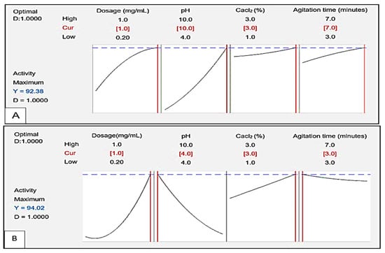 Figure 8 presents the contour (A) and response surface (B) plots illustrating the impact of dosage and pH on the flocculating activity of the bioflocculant Kp1. The darker green area in the contour plot indicates the region with the highest possible flocculating activity values, exceeding 90%. This maximum activity could be achieved within a dosage range of 0.6 to 1.0 mg/mL and a pH range of 8.6 to 10. In contrast, the light green region represents the conditions with the lowest flocculation (<75%), which could occur within dosage sizes of 0.2 to 0.45 mg/mL and pH ranges of 4 to 8.5. These observations suggested that alkaline pH and higher dosage levels were favourable for effective aggregation of particles when using bioflocculant Kp1. The positive influence of increased dosage is consistent with the study by Hadiyanto et al. [], which indicated that an optimal bioflocculant concentration enhances particle aggregation by increasing the availability of active functional groups that interact with suspended particles.