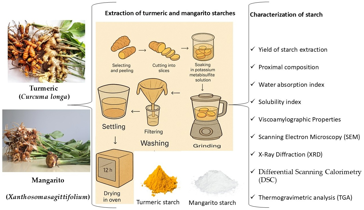 Nogueira, G.F.; Carvalho, C.W.P.d.; Velasco, J.I.; Matta Fakhouri, F. Extraction and Characterization of Starches from Non-Conventional Sources: Turmeric (Curcuma longa) and Mangarito (Xanthosoma sagittifolium). Polymers 2025, 17, 3157. https://doi.org/10.3390/polym17233157