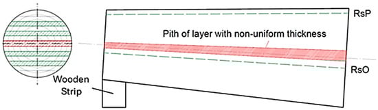 A sawing pattern through and through (live pattern) was designed for the logs (Figure 1), which was carried out in two stages. In the first stage (first half of the log), the saw was parallel to the surface of the log (RsP), while in the second stage (second half of the log), the saw was parallel to the axis of the log (RsO). The correct position of the log was set using stickers with different thicknesses (the thickness of the stickers depended on the taper of the log).