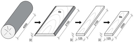 Every second layer was selected from each log for evaluation of the effect of annual ring slope (Figure 1), resulting in a total of 16 pieces of unedged timber. This timber was then edged and sawn to a width of 125 mm (fresh state) on an SCM Nova SI300s circular saw and shortened to a length of 2100 mm (Figure 2). After sawing, 16 boards were selected for further processing. The rest was used to fill the timber pile. The selected lumber (16 pieces) was trimmed at the ends and shortened to a length of 2000 mm.