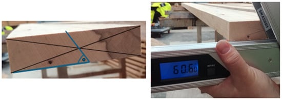 To correctly classify the sawn timber into individual categories (tangential, radial), we had to determine the slope of the annual rings using a digital protractor—Type 0-42-087 (Measuring range from 0° to 225° (angle), Accuracy: ±0.1°). This procedure was applied to 16 selected samples on both ends. The procedure is shown in Figure 3 []. Based on these values, the lumber could then be classified as radial (60–90°) or tangential timber (0–30°).