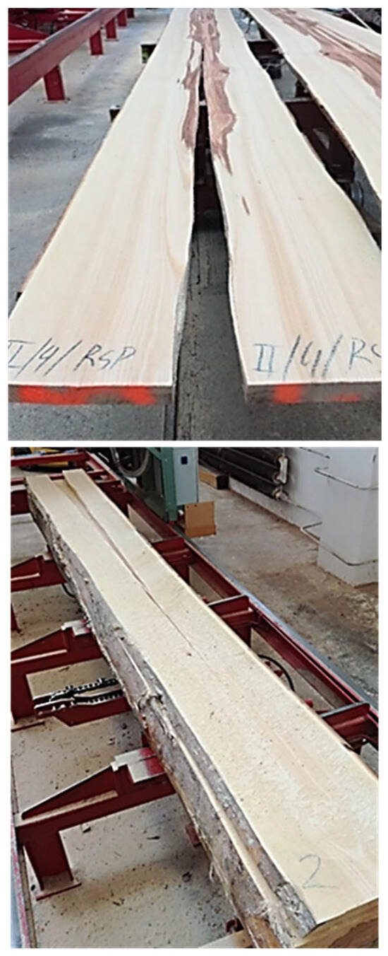 As a result of the change in the type of sawing pattern between the first and second stages, a timber with asymmetrical thickness at each end was created in the central part of the log (Figure 1, marked in red). This unedged sawn timber layer contained a large proportion of pith, which could significantly affect the dimensional stability of the future edged timber. For these reasons, this layer was removed. The sawing pattern was performed on a Mebor HTZ 1000 horizontal log band saw. The thickness of the future timber was 32 mm in the fresh state.