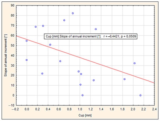 Figure 8 shows the relationship between the slope of annual rings and the value of transverse warping. Correlation analysis showed a moderately strong negative correlation (r = −0.4421), which means that as the slope of annual rings increases, transverse warping decreases. This trend is also confirmed by the regression line, which has a downward slope. The significance level p = 0.0509 is just above the 0.05 threshold, indicating that the relationship is on the verge of statistical significance. The results, therefore, indicate that timber with a higher slope of annual rings tends to exhibit better dimensional stability, but a larger sample set would be needed for definitive confirmation.