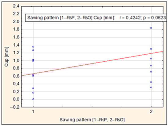 Figure 9 shows the relationship between the sawing pattern (RsP, RsO) and the value of transverse warping (Cup) in mm. The correlation analysis shows that there is a moderately strong positive relationship between these variables (r = 0.4242), i.e., when switching from pattern RsP (1) to RsO (2), the curvature tends to increase. However, the value p = 0.0623 shows that statistical significance was not achieved at the commonly used 5% significance level. In other words, we can assume greater material deflection with the RsO pattern, but the result cannot be interpreted as clearly confirmed.