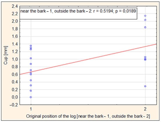 The results of the analysis of the influence of the original position of the log in the cut on the occurrence of cup warping showed that timbers originating from the area closer to the center of the log exhibited a higher degree of this warping compared to timbers sawn near the bark (Figure 10). Pearson’s correlation coefficient (r = 0.5194) indicates a moderately strong positive correlation between these variables, and the value p = 0.0189 confirms the statistical significance of this relationship. These findings suggest that the location of the log in the trunk can significantly affect the shape stability and intensity of cup warping in the final product.