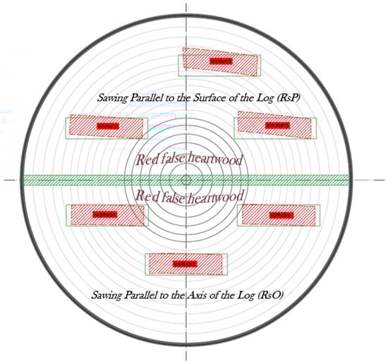 As a result of the change in the type of sawing pattern between the first and second stages, a timber with asymmetrical thickness at each end was created in the central part of the log (Figure 1, marked in red). This unedged sawn timber layer contained a large proportion of pith, which could significantly affect the dimensional stability of the future edged timber. For these reasons, this layer was removed. The sawing pattern was performed on a Mebor HTZ 1000 horizontal log band saw. The thickness of the future timber was 32 mm in the fresh state.
