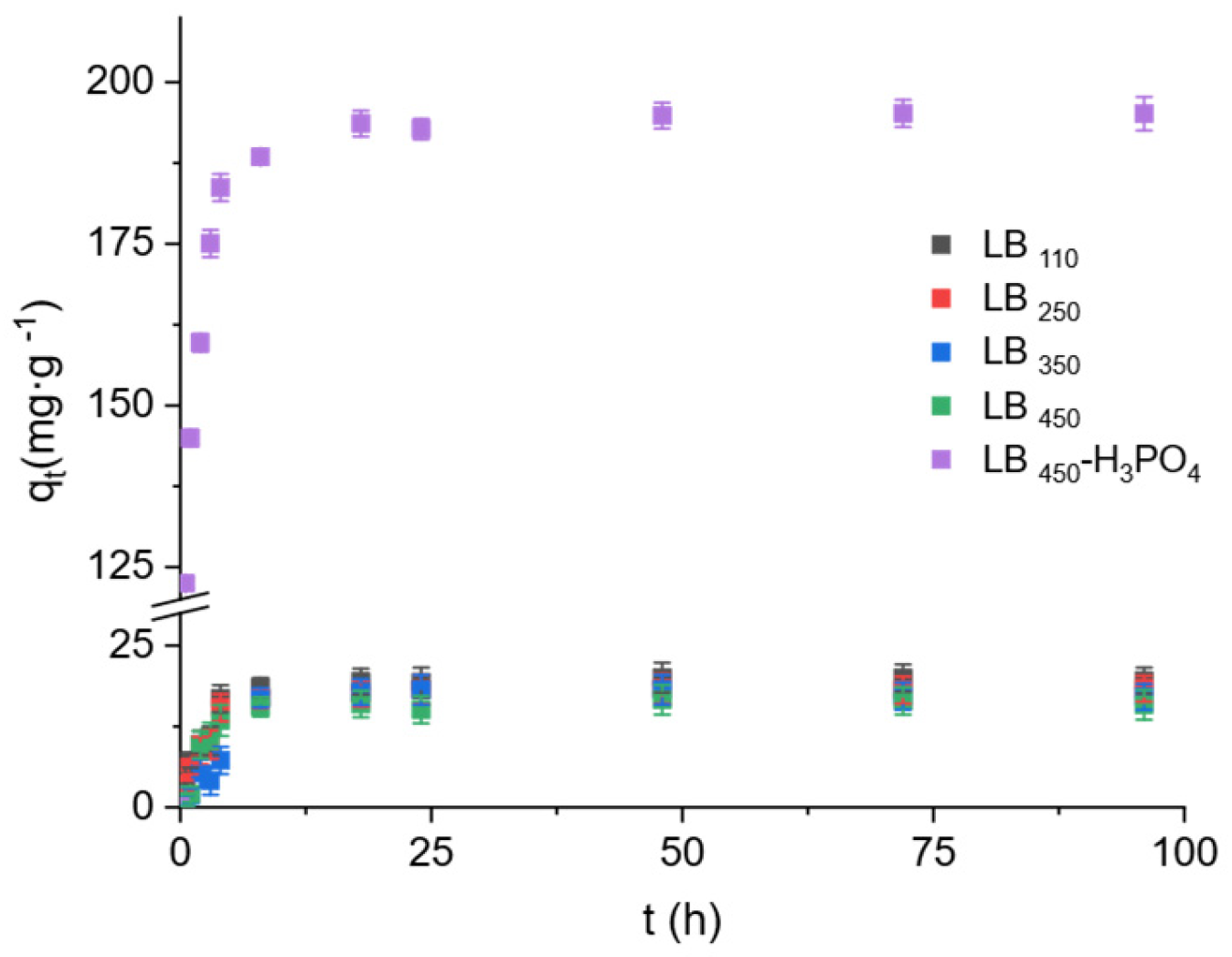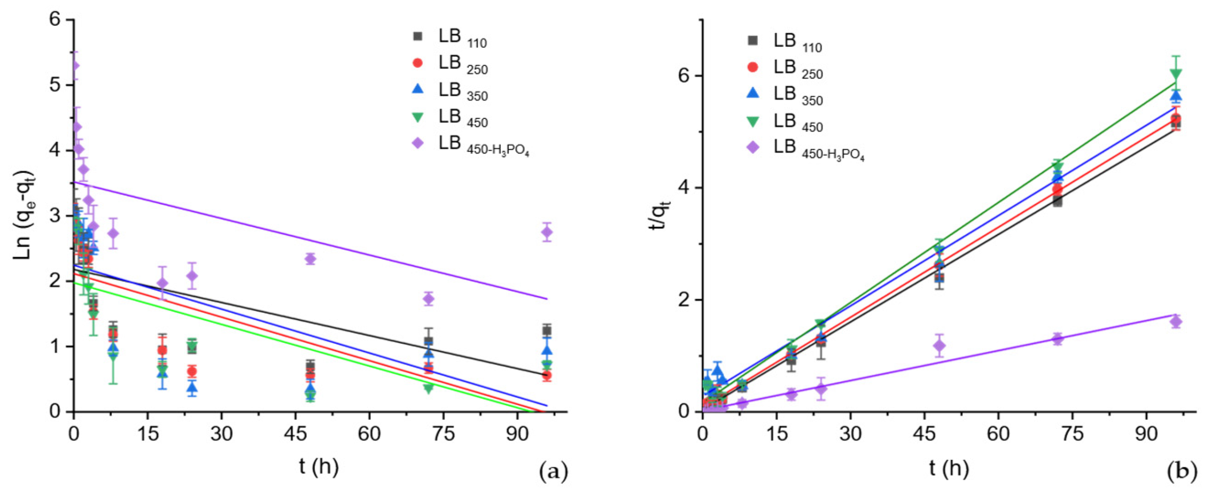 | LB450-H3PO4 | 107 ± 12 | 262.28 ± 14.3 | 0.01 ± 0.01 | 0.964 | 0.21 ± 0.05 | 128.43 ± 2.61 | 0.974 |