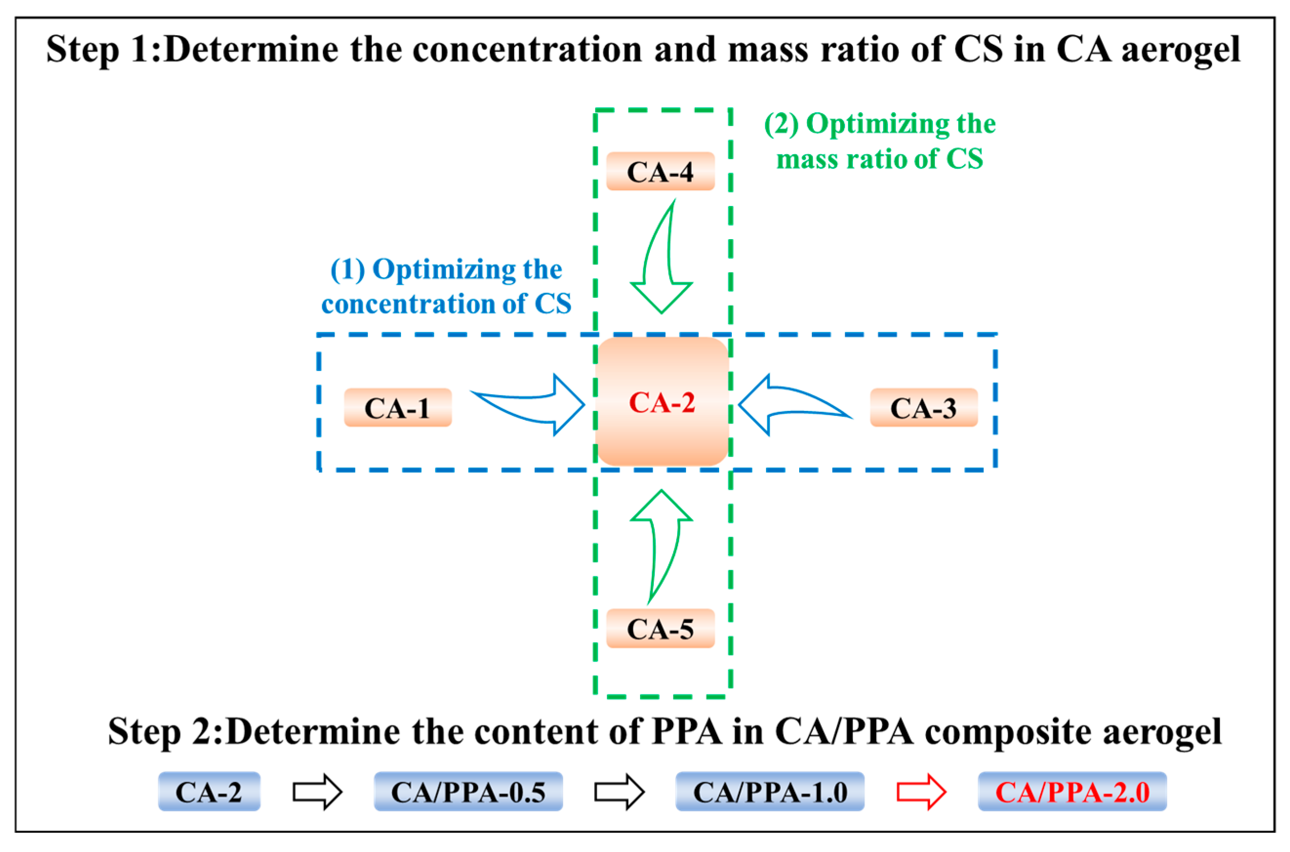 The concentration of CS solution and the content of flame retardants substantially impact the performance of the target aerogel [21]. The composition ratios of the CA/PPA composite aerogels are listed in Table 1. Figure 1 depicts the study framework for this study. Briefly, the samples of CA-1, CA-2, and CA-3 are used to determine the optimized concentration of CS precursor in CA composite aerogel. And, at the similar concentration of CS precursor, the CA-2, CA-4, and CA-5 were used to determine the optimized mass ratio between CS precursor and SA precursor in the composite aerogel (CA). Finally, three contents of PPA (0.5 wt%, 1.0 wt%, and 2.0 wt%) in above optimized CA composite aerogel, which are named CA/PPA-0.5, CA/PPA-1.0, and CA/PPA-2.0, respectively, were prepared.