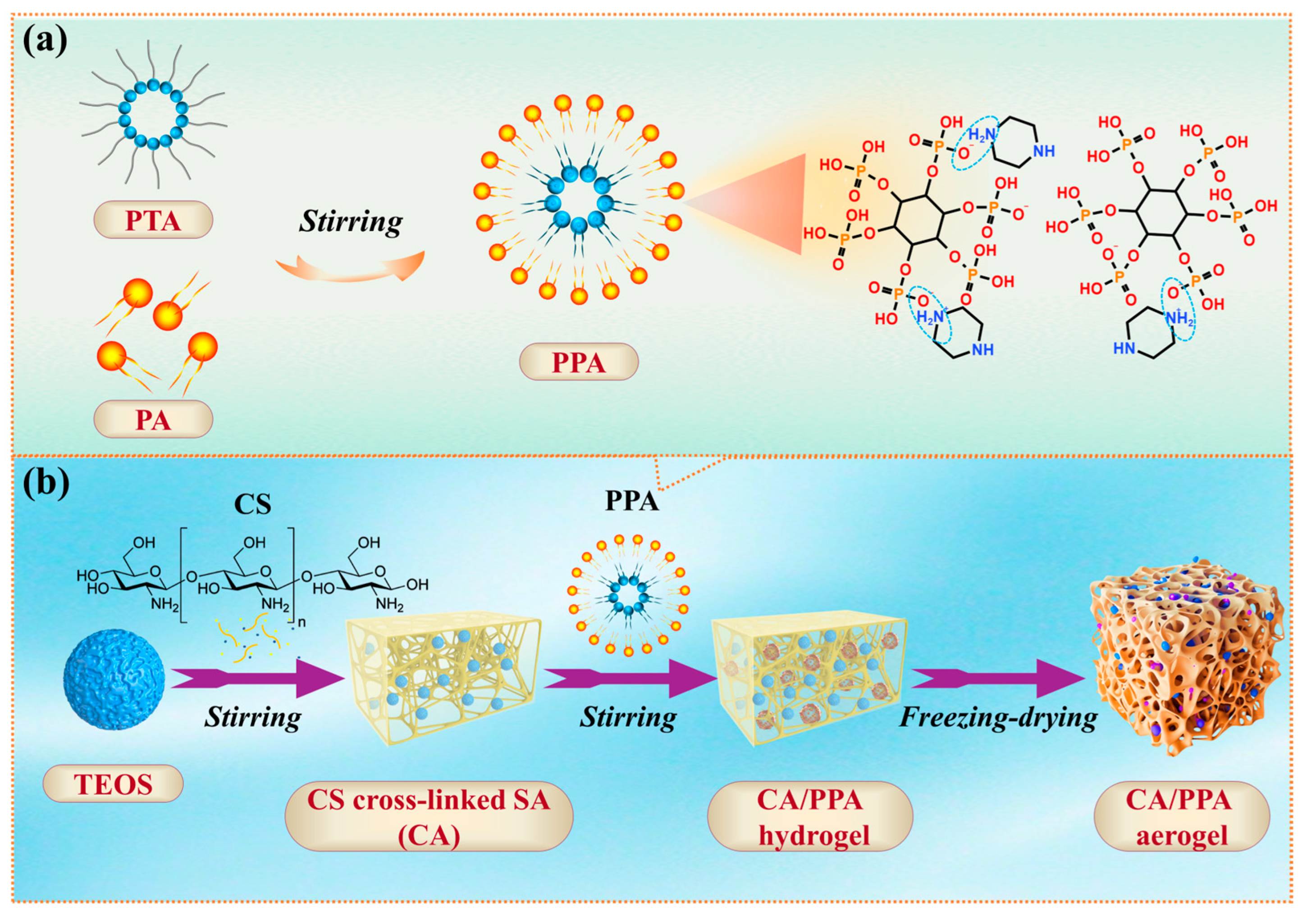 Take CA/PPA-1.0 aerogel (the concentration of CS precursor is 2.0 g/100 mL; the mass ratio between CS precursor and SA is 6:1; PPA content in CA/PPA system is 1.0 wt%) as an example, and the routes are presented as follows. A total of 8 g of CS was added to 400 mL acetic acid aqueous solution (the mass ratio of acetic acid and deionized water is 4:96) and magnetically stirred at 60 °C for 5 h to form a homogeneous CS precursor solution. A mixture of TEOS, ethanol, and deionized water (volume ratio 3:6:1) was magnetically stirred for 30 min. Hydrochloric acid was added to adjust the pH to 2–3. The above solution was then heated at 60 °C with stirring for 2.5 h to prepare the SA precursor solution. The SA precursor and CS precursor solutions (mass ratio 1:6, total mass is 99.0 g) were blended by magnetic stirring for 5 min and ultrasonicated for 30 min to ensure uniform dispersion. A total of 1.0 g of PPA powder was then added to the 99.0 g mixed precursor solution. After the above aqueous dispersion was completely solidified in a −35 °C freezer, it was lyophilized in a freeze-dryer (−65 °C, 0.1 Pa) for 72 h. Finally, the CA/PPA-1.0 composite aerogel was obtained.