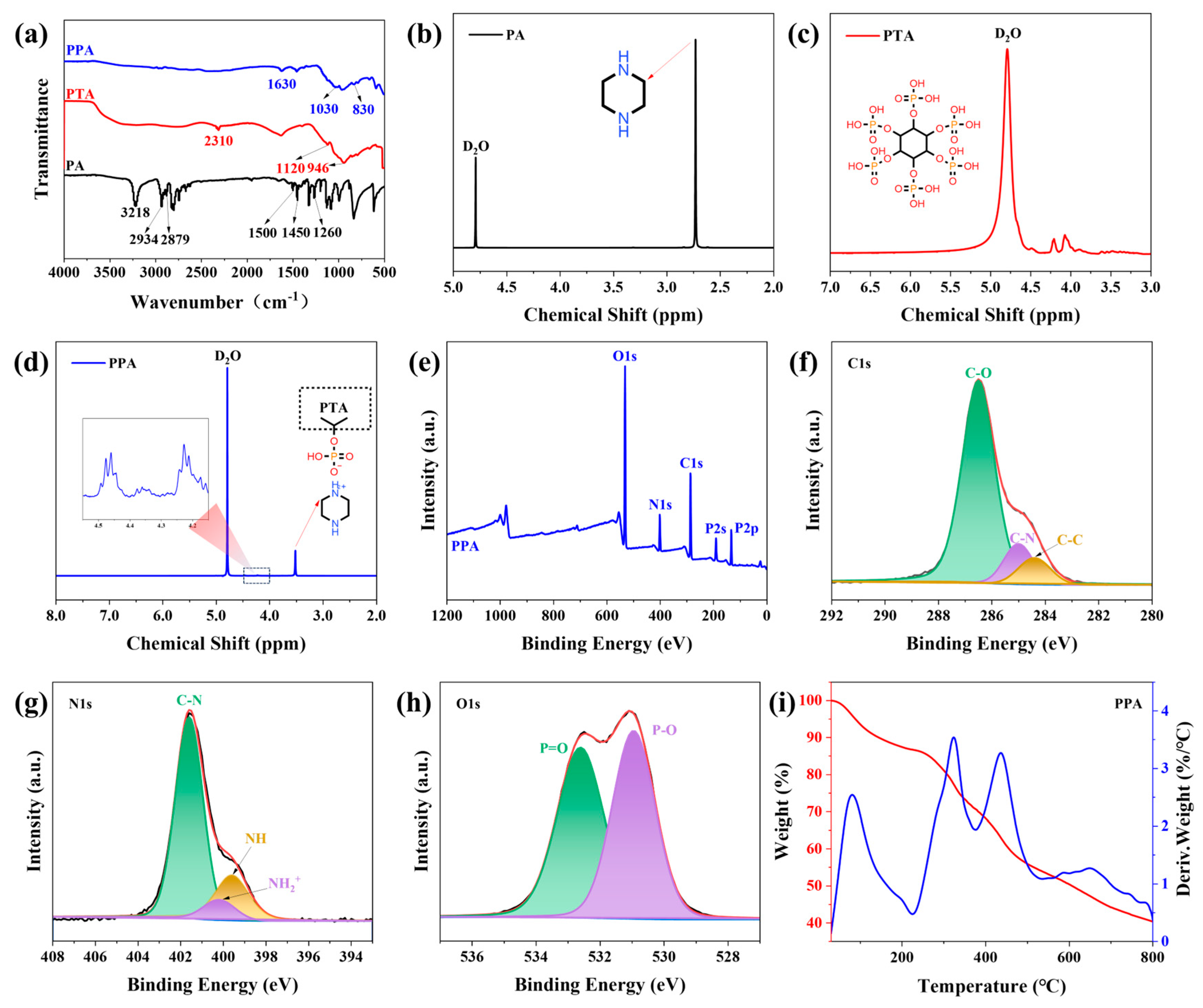 Figure 3. (a) FT-IR spectra; 1H-NMR spectrum of (b) PA, (c) PTA and (d) PPA; (eh) XPS spectra of PPA; (i) TGA and DTG curves of PPA powder.
