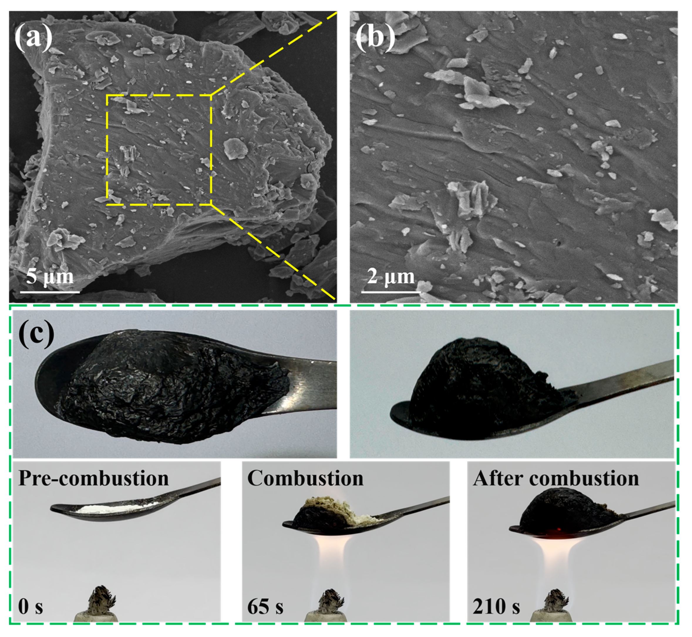 Figure 4a,b shows the SEM image of PPA. The surface of PPA exhibits a distinct multilayered structure with roughness, which provides indirect evidence that PA and PTA undergo supramolecular assembly through cation–anion interactions to form aggregates. Figure 4c displays the IFR performance of the PPA flame retardant under heating. The PPA powder appears faint yellow prior to heat exposure. Upon ignition of the alcohol lamp, heat is transferred to the lower portion of the spoon. After it absorbs significant heat, the PPA begins to thermally release non-flammable gases, causing the char layer to expand and eventually forming a dense and stable protective charring layer [39].