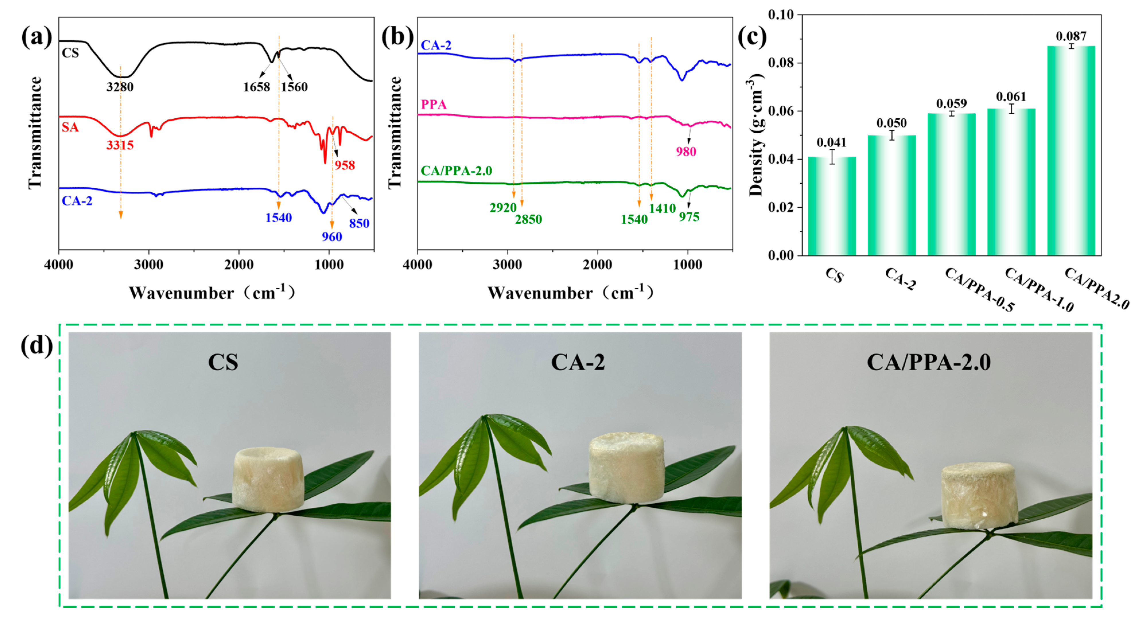 Figure 5. FTIR spectra of (a) CS, SA, and CA-2 aerogels and (b) CA-2, PPA and CA/PPA-2.0 aerogels; (c) density data plot of the CA/PPA composite; (d) photograph of composite aerogel under leaves.