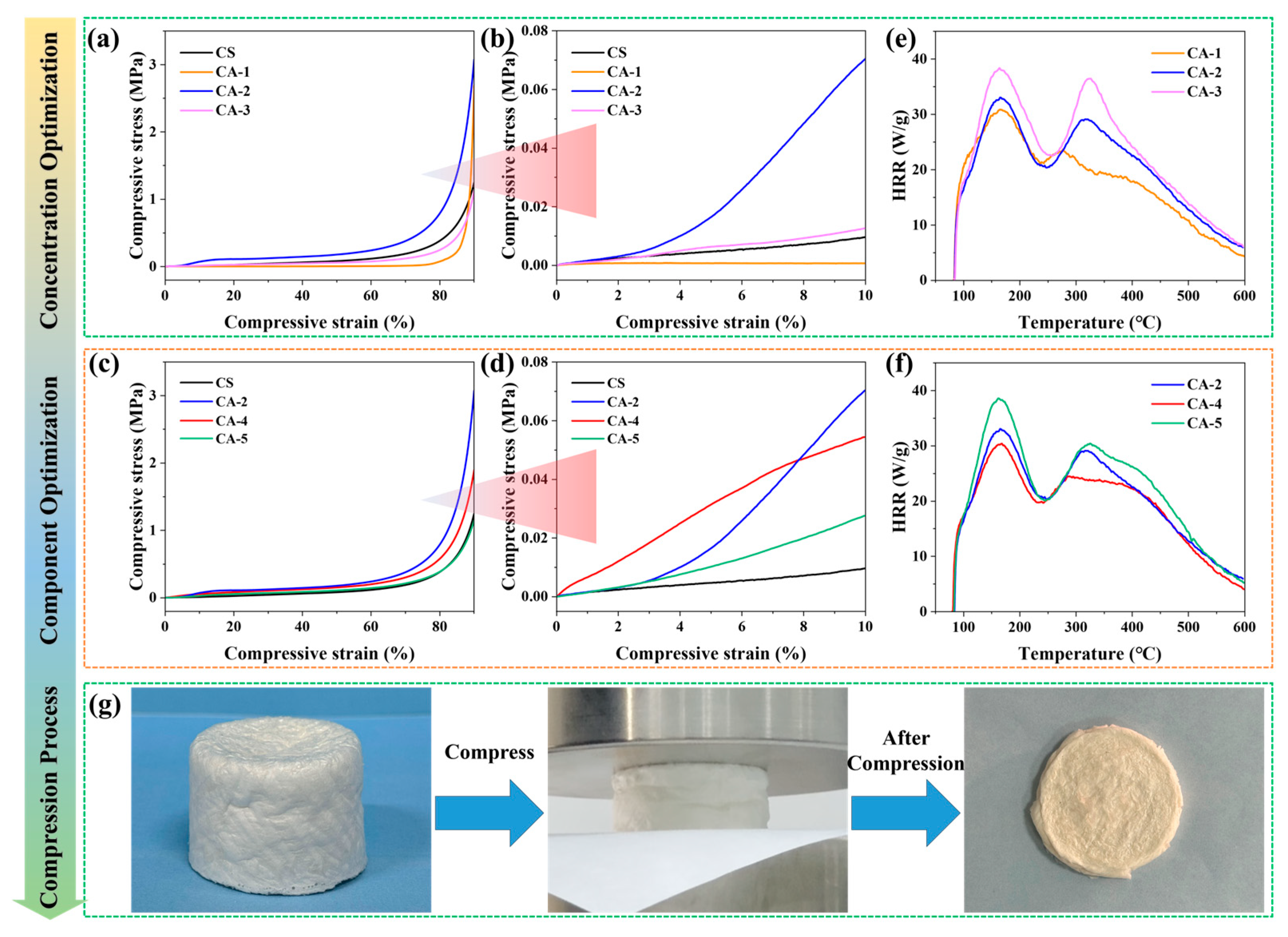 Figure 7. (ad) Compressive stress–strain curves of the aerogels; (e,f) HRR curves of aerogels under MCC test; (g) photographs of the compression process of CA-2.