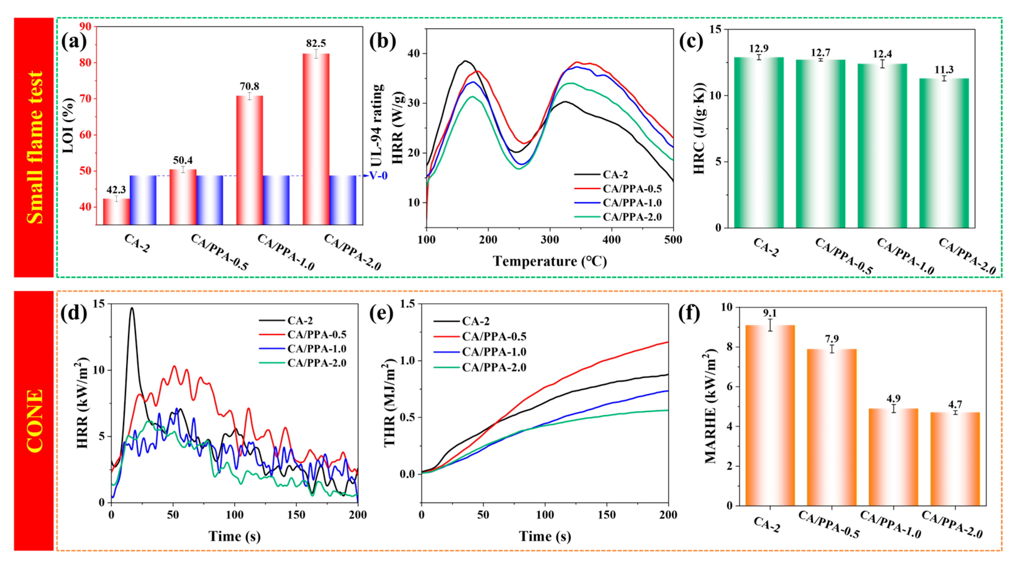 As presented in Figure 8a, with loading 0.5, 1.0, and 2.0 wt% PPA in CA-2, their LOI values increased from 42.3% to 50.4%, 70.8%, and 82.5%, respectively. In the UL-94 test, all CA/PPA composite aerogels achieved a V-0 rating with no melt dripping. The HRR versus temperature curves and the HRC of the aerogels, obtained from MCC tests, are presented in Figure 8b,c. The two components—chitosan and silica—display distinct thermal degradation behaviors, resulting in two different PHRRm for the CA composite aerogel [45]. With loading 0.5, 1.0, and 2.0 wt% PPA in CA-2, their HRC values decreased from 12.9 J/(g·K) to 12.7, 12.4, and 11.3 J/(g·K), respectively. CONE provides essential information regarding the flammability and smoke emission of composites, with the associated data correlating well with full-scale fire tests [20]. The HRR and THR versus time curves, and the maximum average rate of heat emission (MARHE) of the aerogels, obtained from CONE tests, are shown in Figure 8d–f. The CA/PPA composite aerogels with three contents of PPA (0.5, 1.0, and 2.0 wt%) were named CA/PPA-0.5, CA/PPA-1.0, and CA/PPA-2.0, respectively. CA-2 ignites rapidly within 12 s. However, all CA/PPA composite aerogels remain in a smoldering state with no obvious flame. As presented in Figure 8, with an increasing loading of PPA, the values of PHRRm, PHRRc, and THRc of their composite aerogel exhibit a trend of decreasing. Compared to CA-2, the values of PHRRm, PHRRc, and THRc of CA/PPA-2.0 decreased by 18.9%, 62.1%, and 55.6%, respectively.